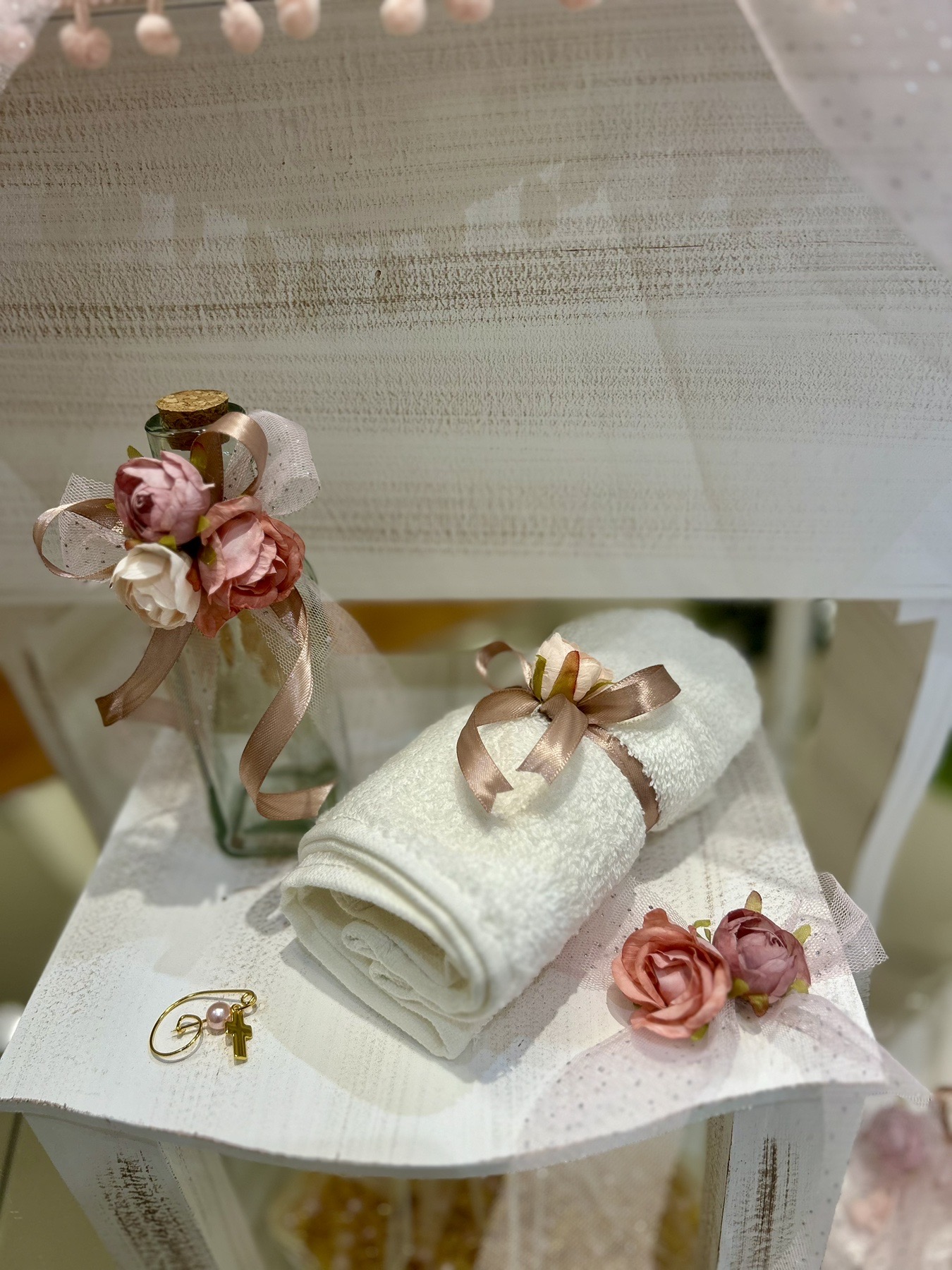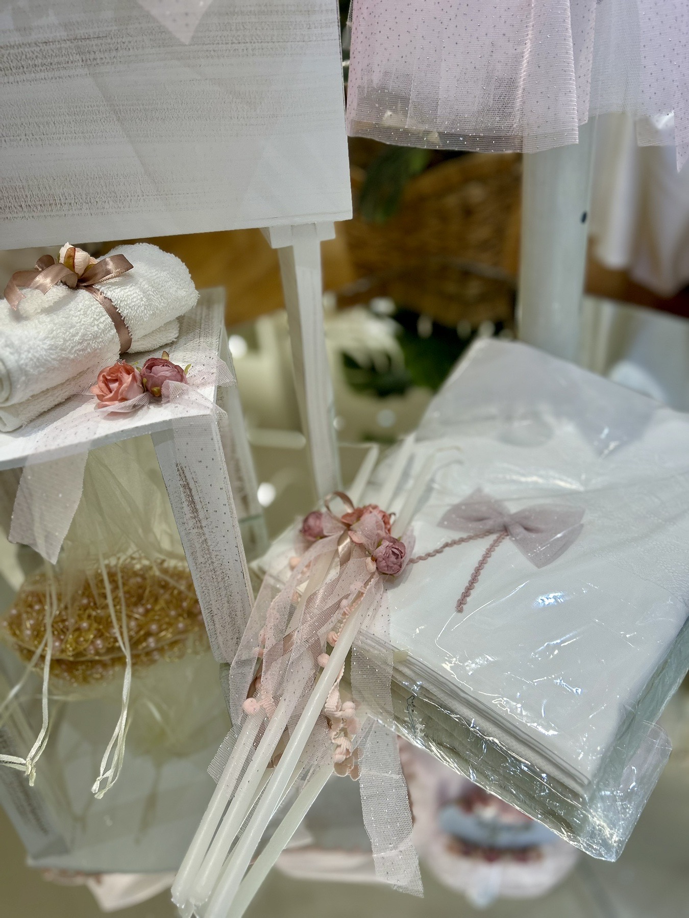 Ολοκληρωμένο πακέτο βάπτισης με ψάθινη τσάντα σε ρομαντικό στιλ