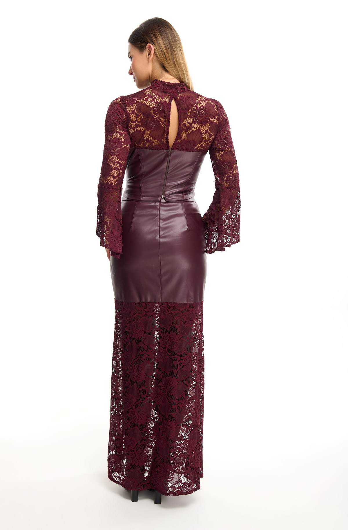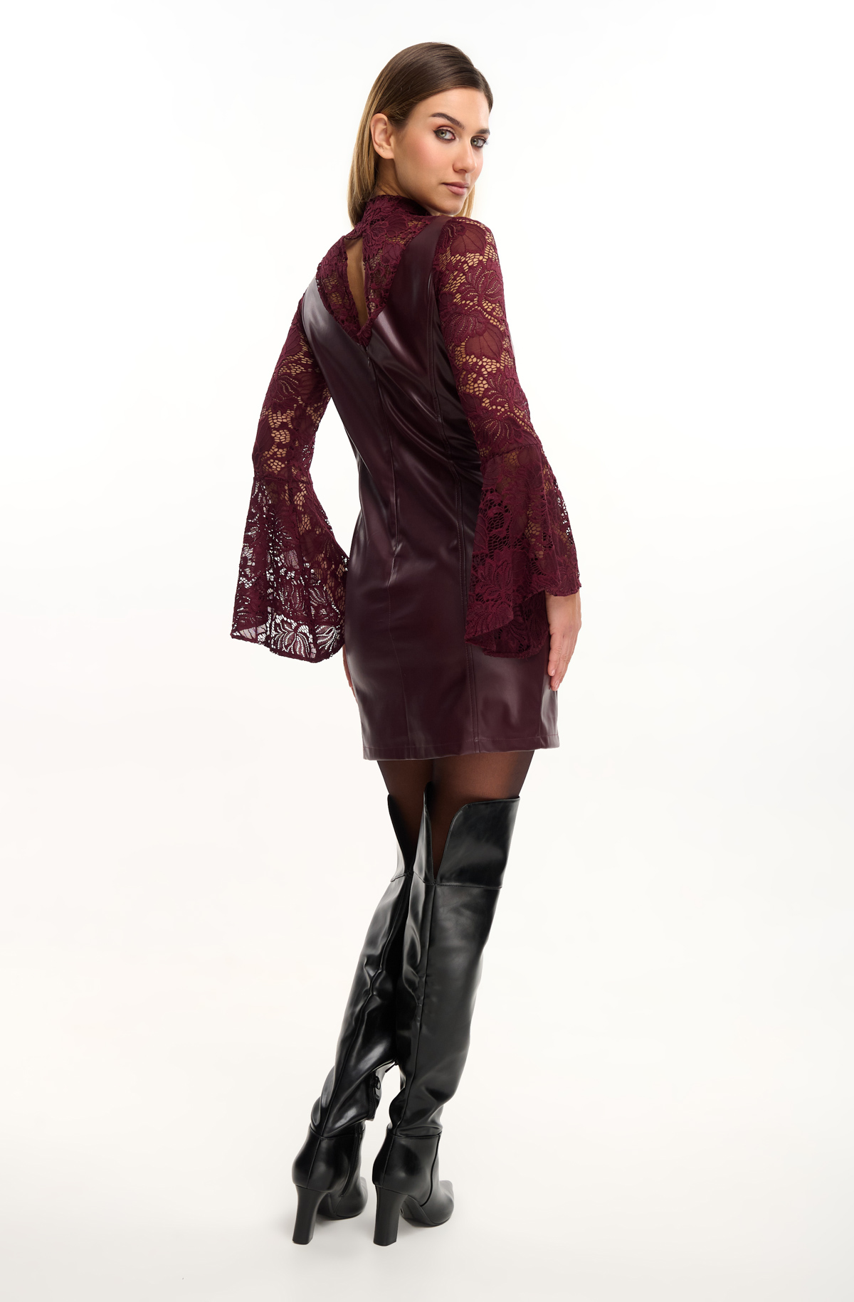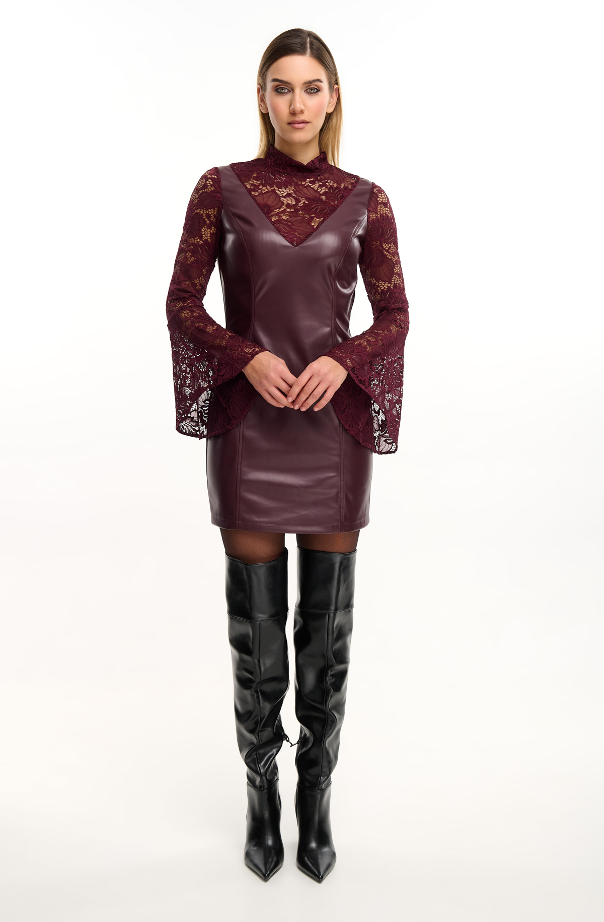 Κοντό γυναικείο φόρεμα από δερματίνη και δαντέλα