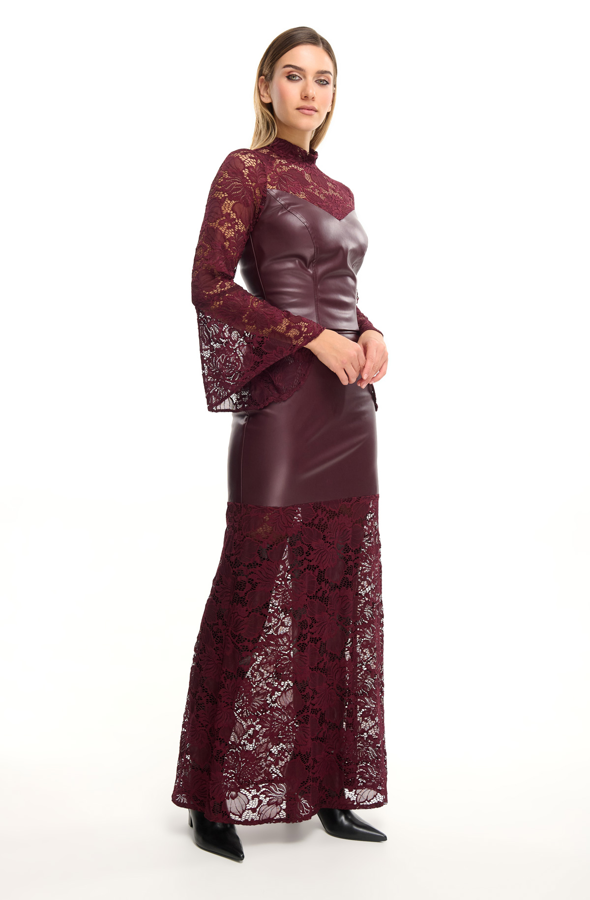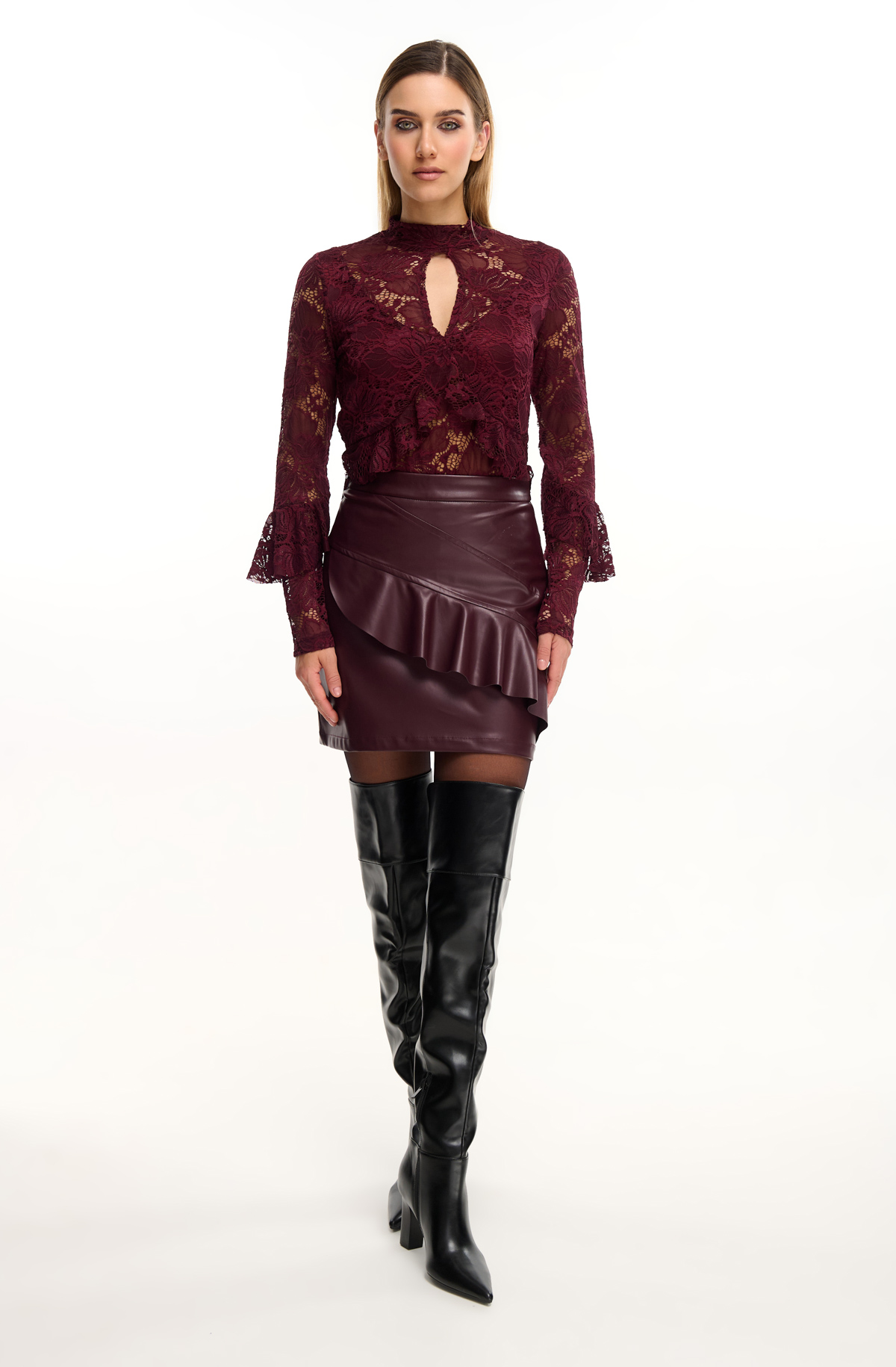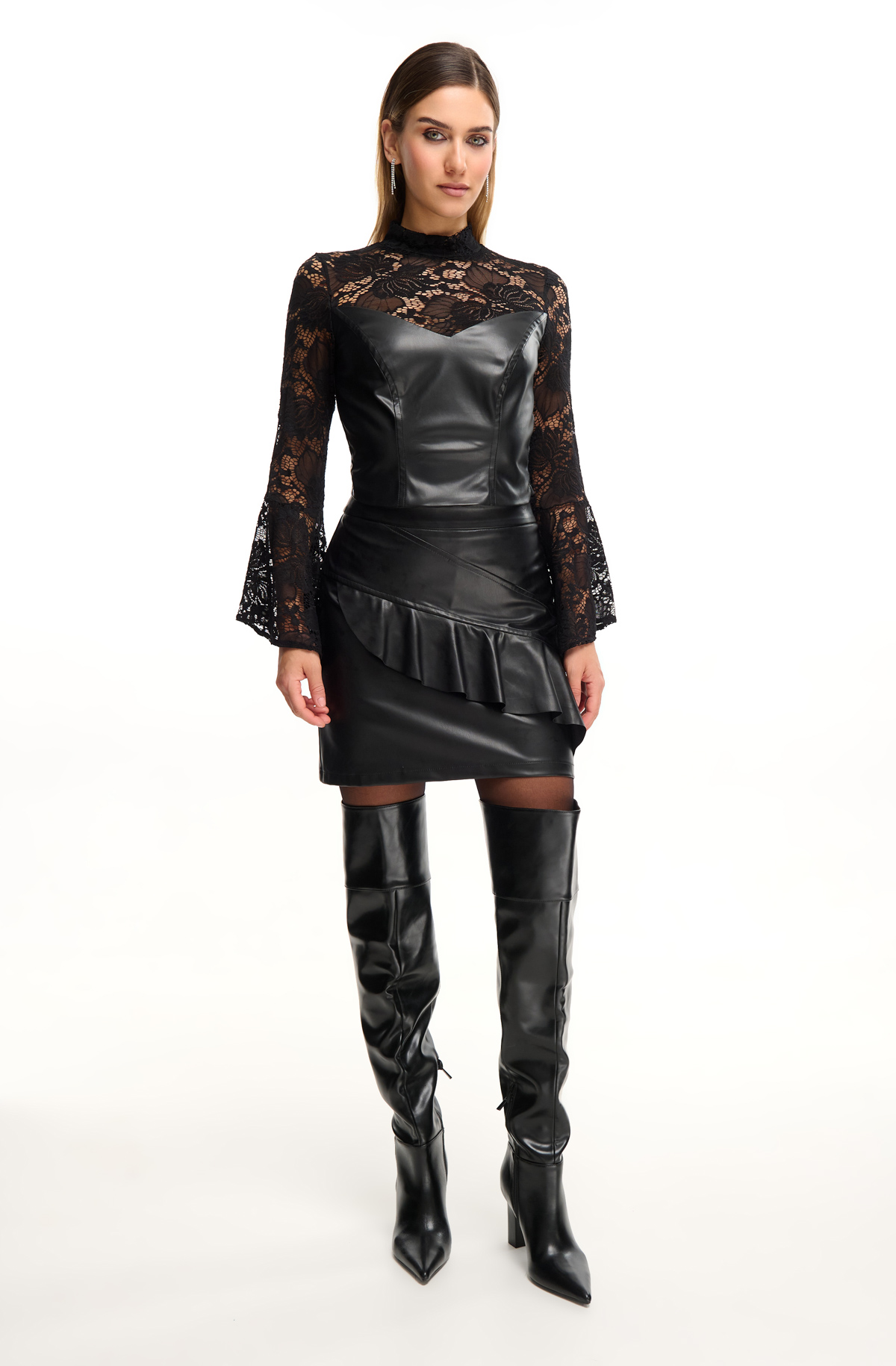 Σετ μπλούζα και φούστα από δαντέλα και δερματίνη