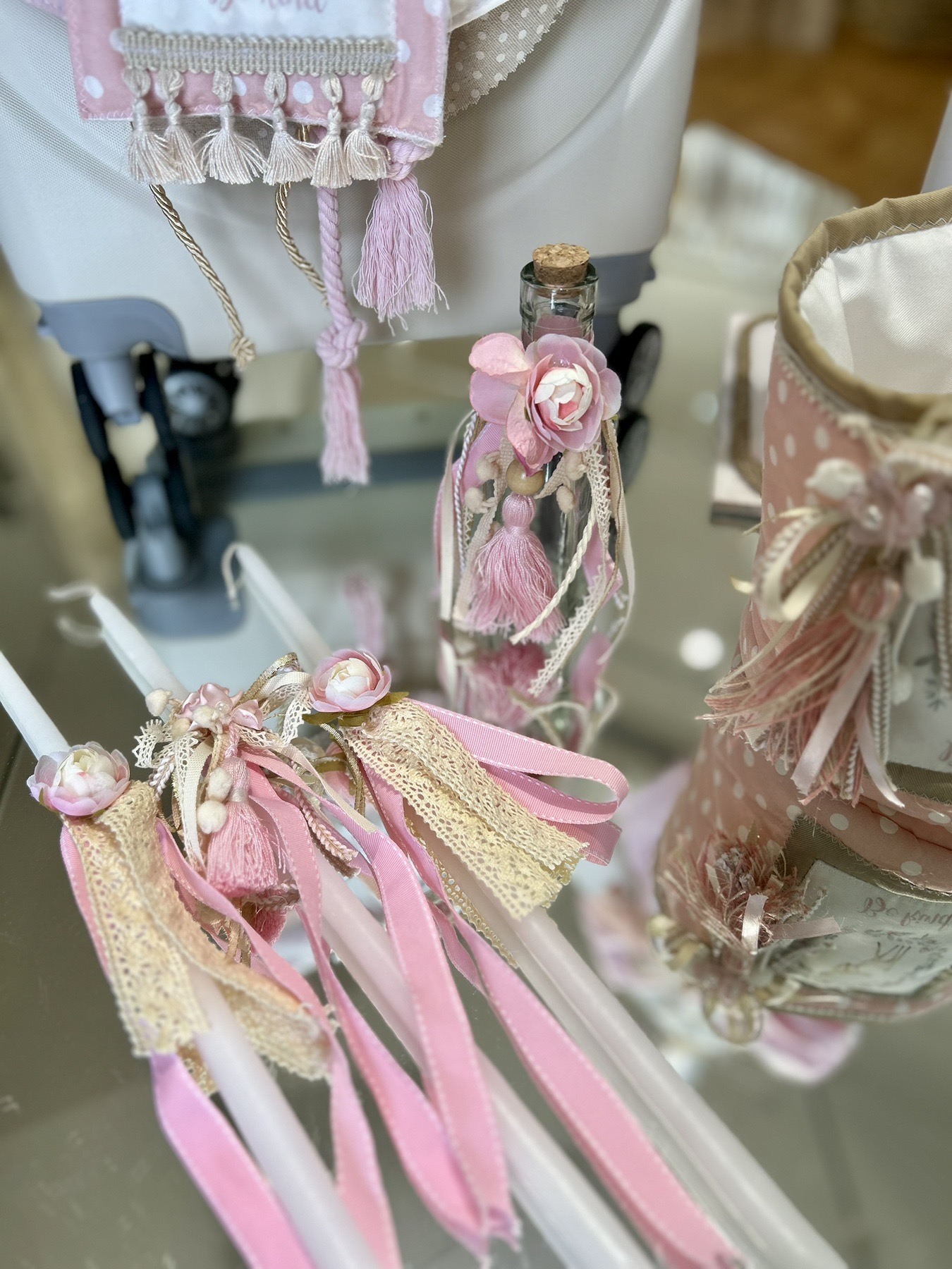Ολοκληρωμένο πακέτο βάπτισης με ψάθινη τσάντα σε ρομαντικό στιλ