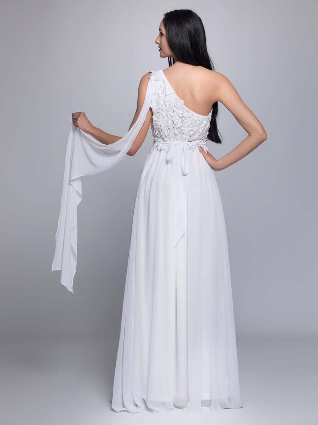 Σατέν νυφικό με κεντημένη δαντέλα στη φούστα και έξω πλάτη. Μπούστο V και δέσιμο στο λαιμό, σε άλφα γραμμή. Κανονική εφαρμογή.
