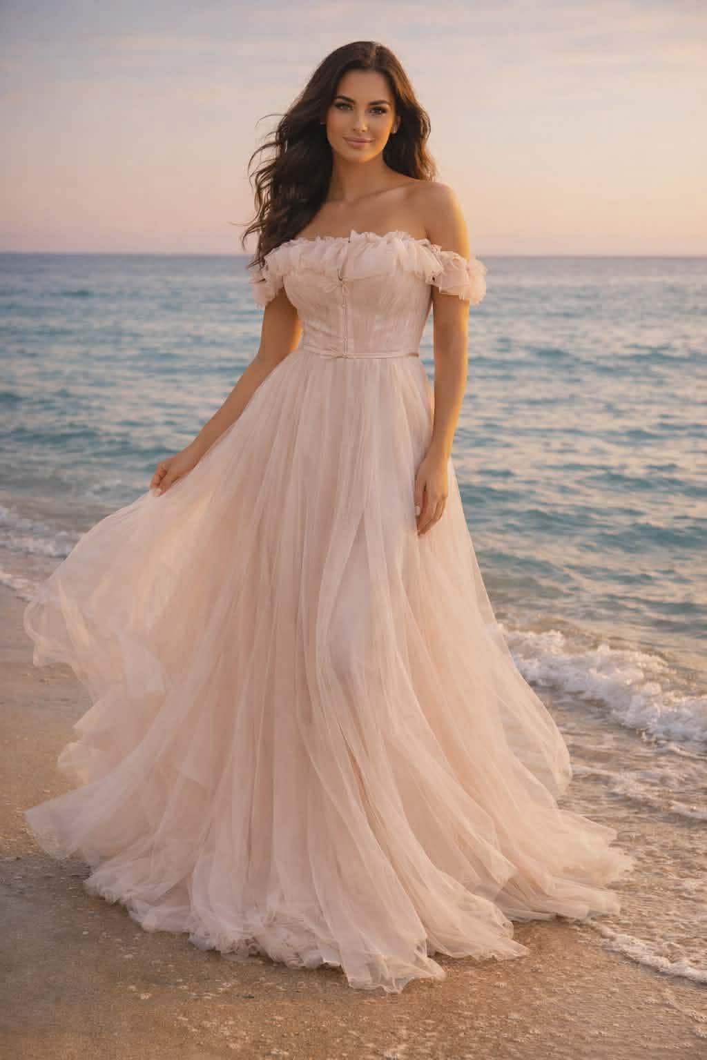 Εντυπωσιακό φόρεμα σε γραμμή Α που συνδυάζει τον ρομαντισμό με την παραμυθένια αισθητική. Διαθέτει top σε στυλ κορσέ που αναδεικνύει τη μέση και κομψή off the shoulder λαιμόκοψη στολισμένη με φίνα βολάν. Η πλούσια, αιθέρια φούστα προσφέρει μοναδική κίνηση, καθιστώντας το ιδανικό για επίσημες εμφανίσεις ή bohemian γάμους.