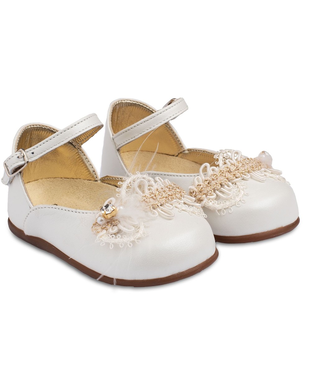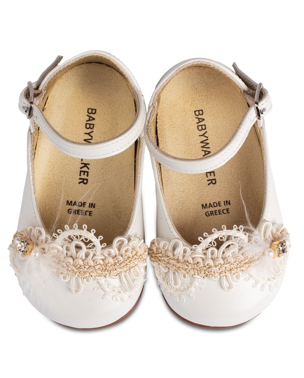 Βαπτιστικά παπούτσια Γαλλικό γοβάκι, διακοσμημένο με τρέσα δαντέλα, πούπουλα και στρας . Σε εκρού χρώμα.
