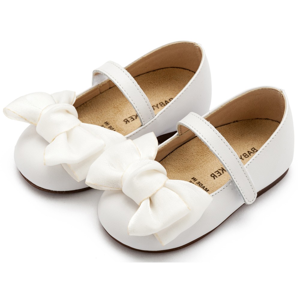 Βαπτιστικά παπούτσια Δερμάτινο γοβάκι μονή μπαρέτα “χρατς” με υφασμάτινο φιόγκο οργάντζας, σε λευκό χρώμα.