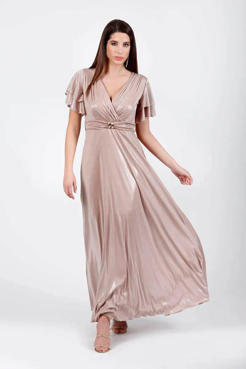 Ένα εντυπωσιακό μακρύ φόρεμα που συνδυάζει κομψότητα και θηλυκότητα. Το ιριδίζον ύφασμα αντανακλά στο φως χαρίζοντας μοναδική λάμψη, ενώ το κολακευτικό V ντεκολτέ και η τονισμένη μέση δημιουργούν μια κομψή σιλουέτα. Τα ανάλαφρα μανίκια με βολάν προσθέτουν ρομαντική διάθεση και η μακριά αέρινη  φούστα χαρίζει κίνηση και χάρη σε κάθε βήμα.
