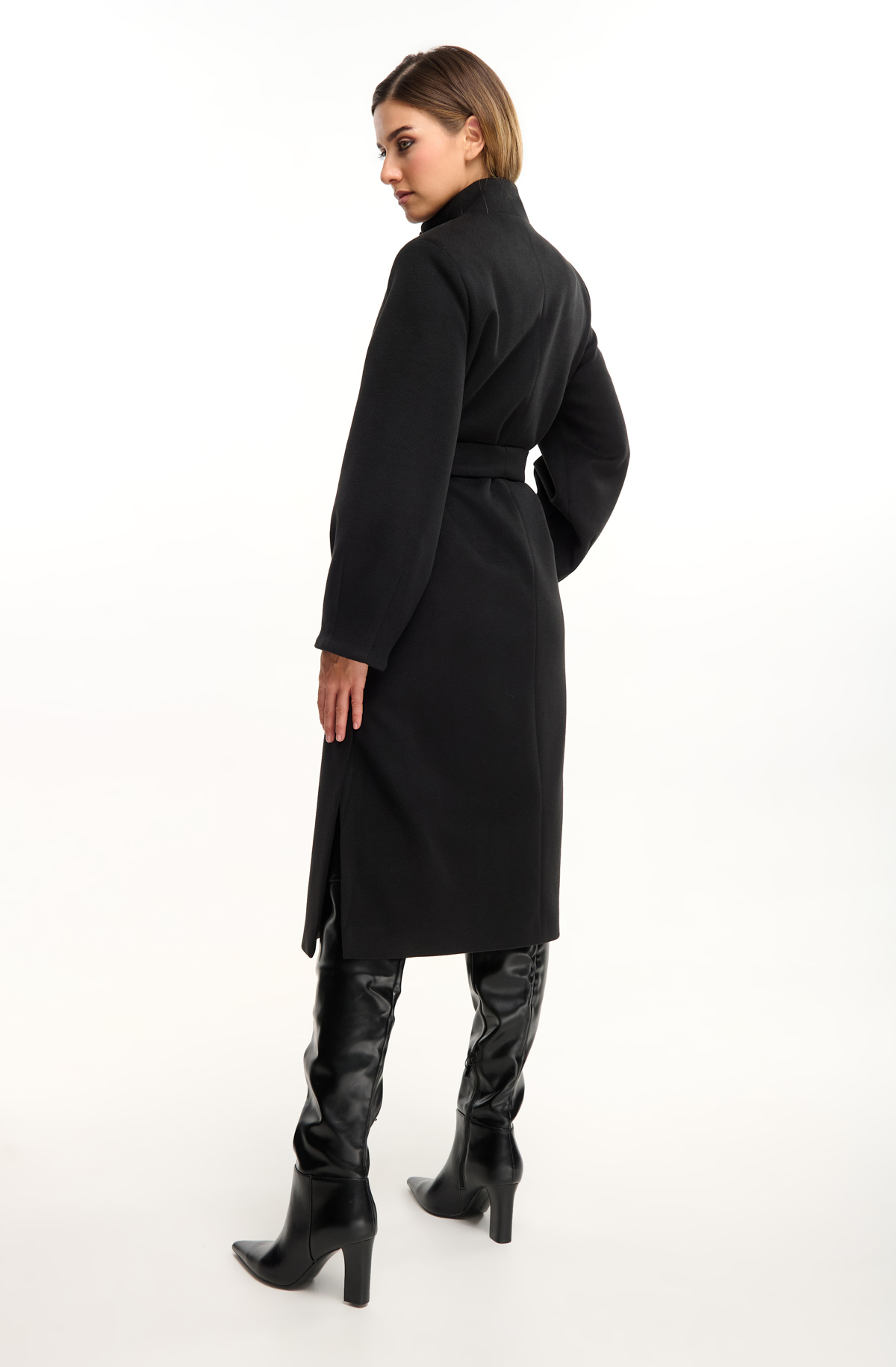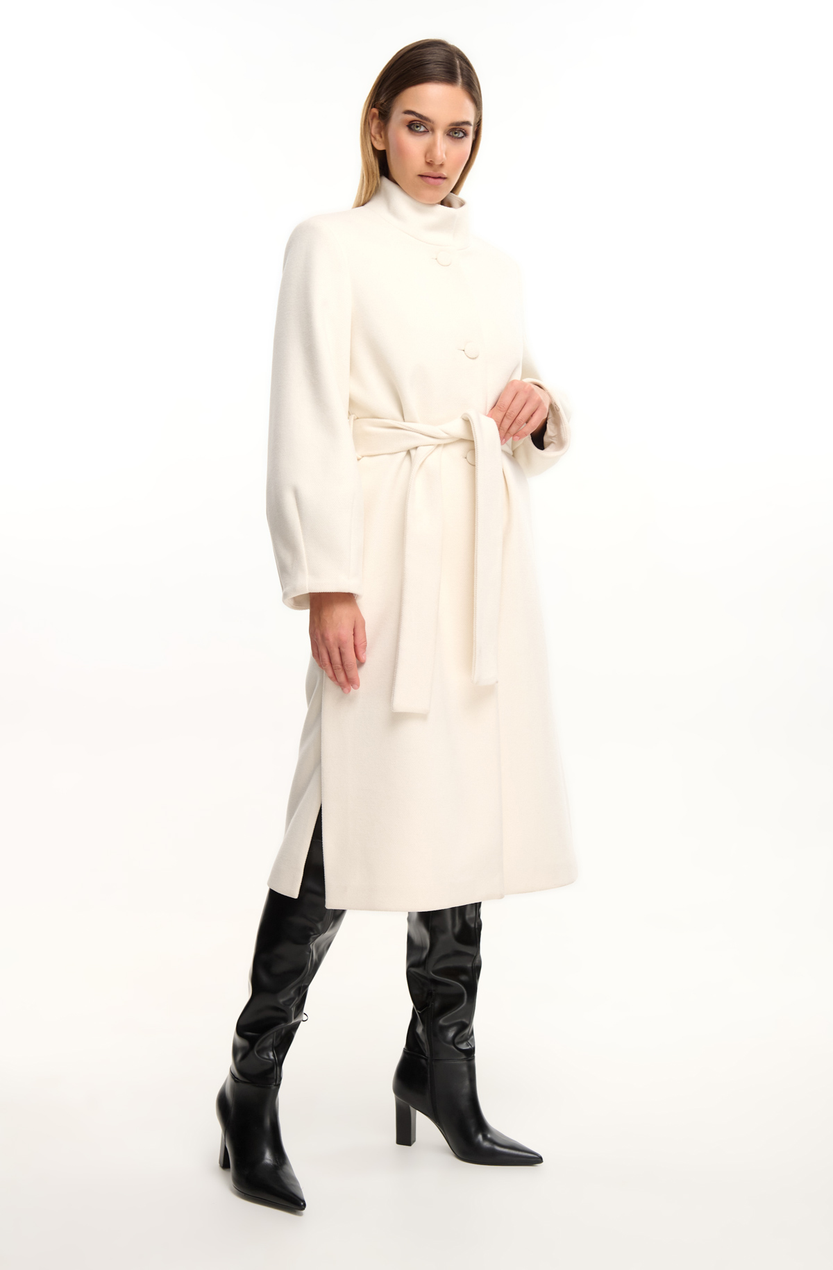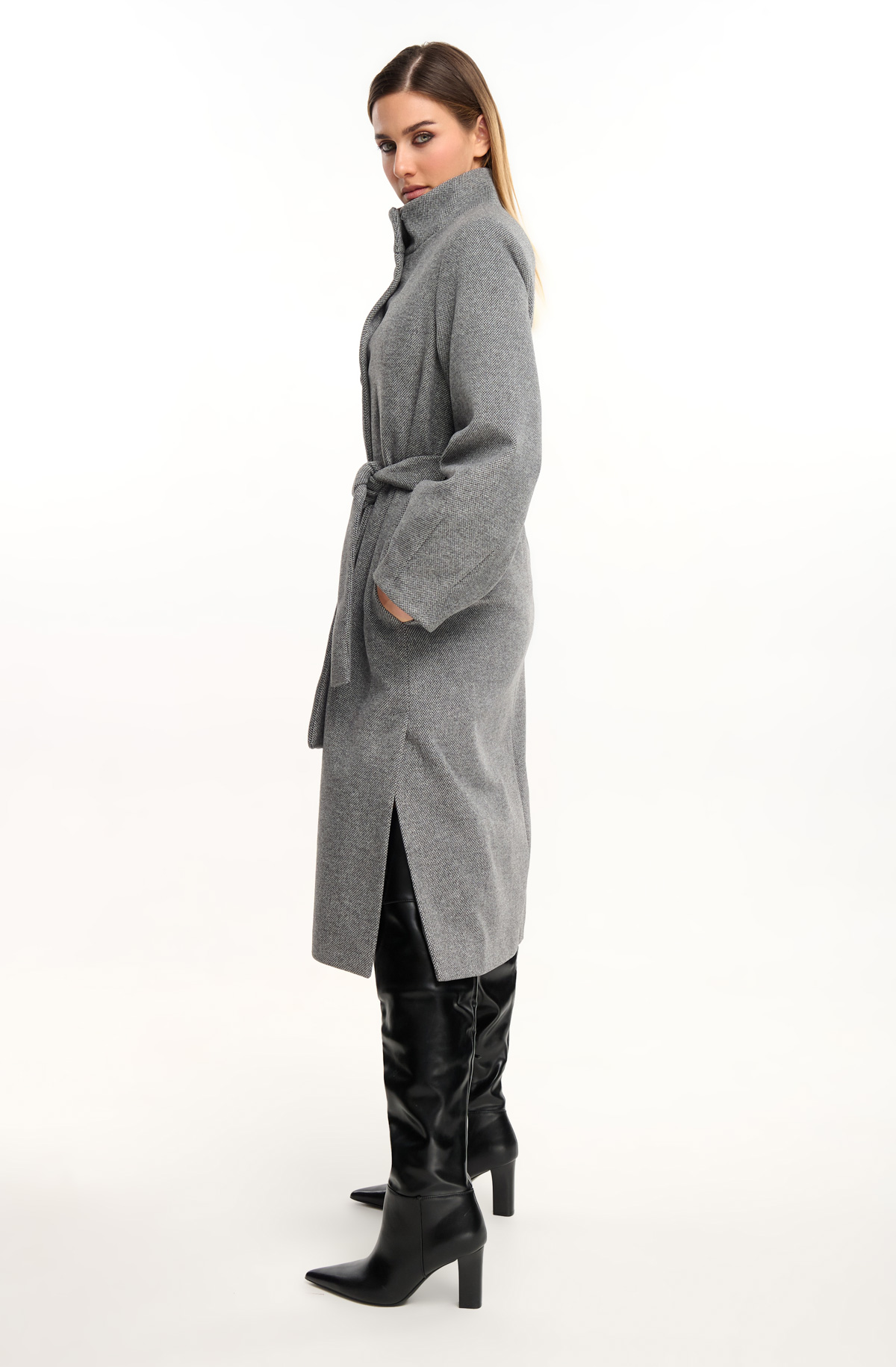 Μακρύ παλτό με όρθιο γιακά και ανοίγματα στο πλάι. Διαθετει αποσπώμενη ζωνη, δυο πλαϊνές τσέπες . Κουμπώνει με κουμπιά. Είναι ελληνικής κατασκευής.