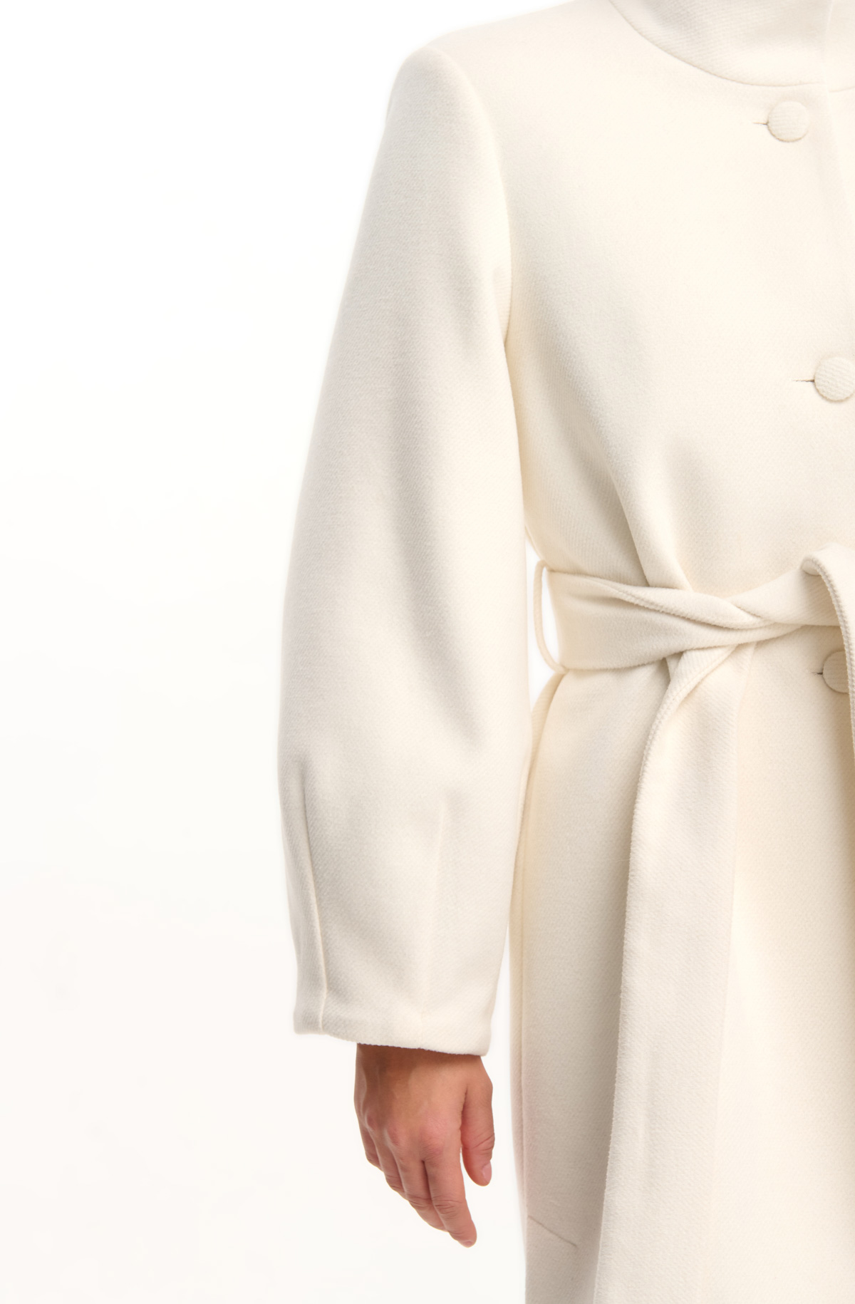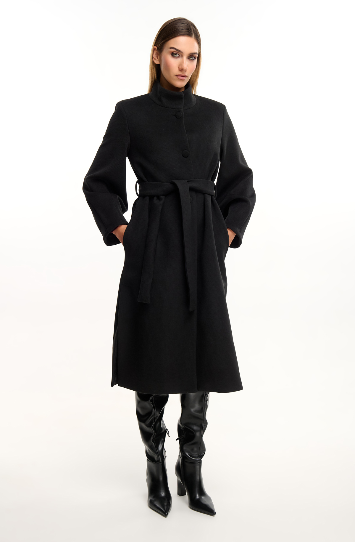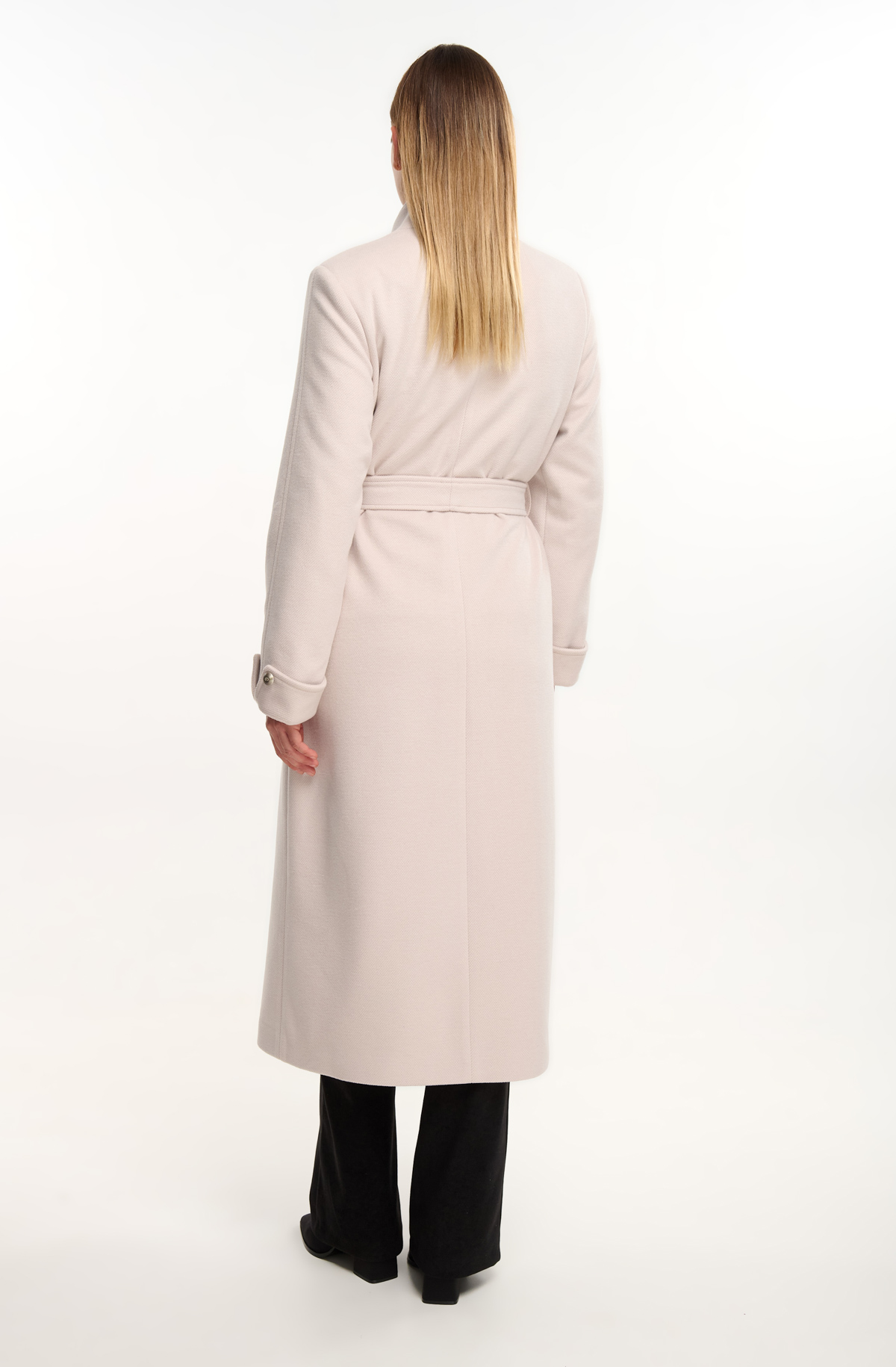Μακρύ παλτό με όρθιο γιακά και ανοίγματα στο πλάι. Διαθετει αποσπώμενη ζωνη, δυο πλαϊνές τσέπες . Κουμπώνει με κουμπιά. Είναι ελληνικής κατασκευής.