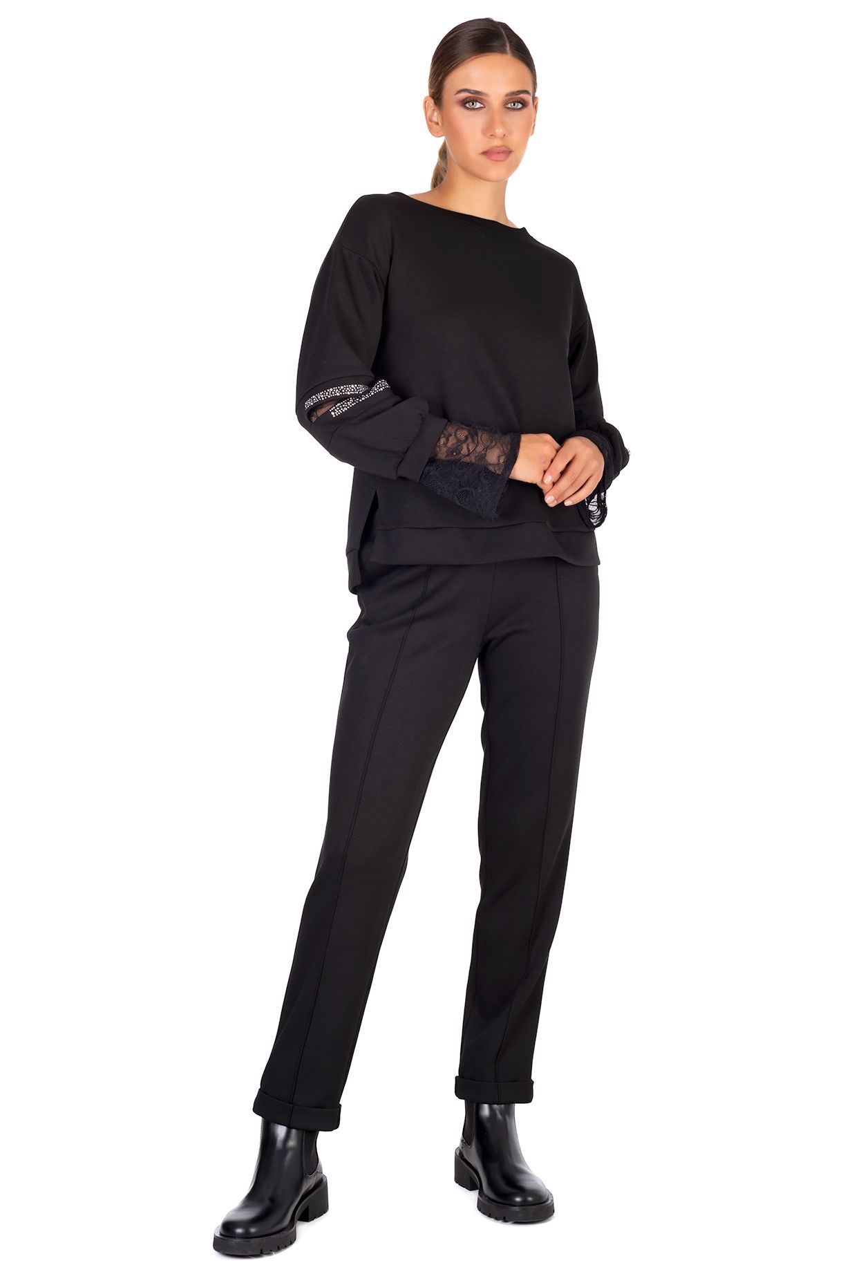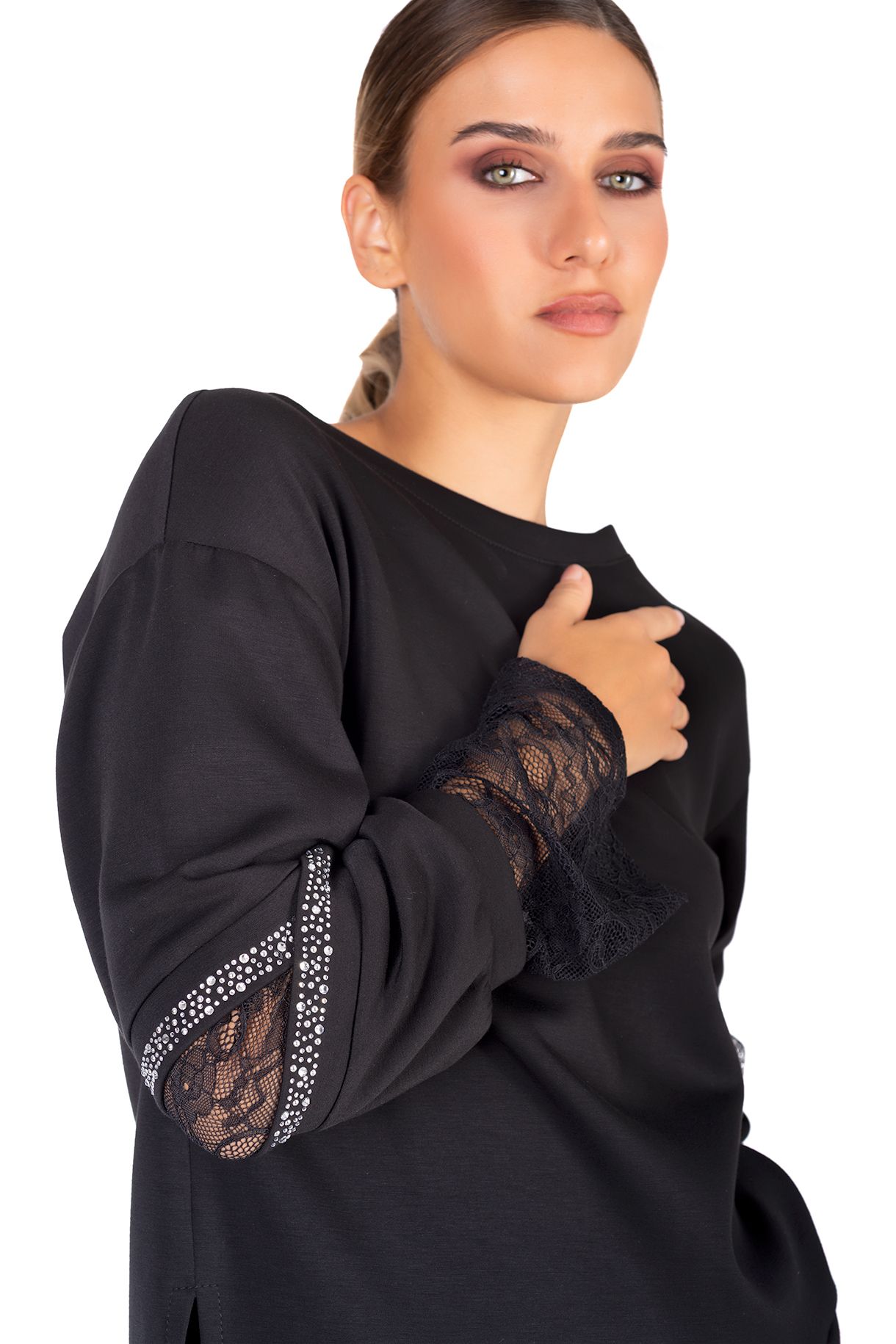 Μαύρη γυναικεία μπλούζα με δαντέλα και strass στα μανίκια . Ελληνικής κατασκευής. Με εσωτερική μαύρη δαντέλα στα μανίκια και strass στο άνοιγμα. Διαθέτει ανοίγματα στο πλάι.
