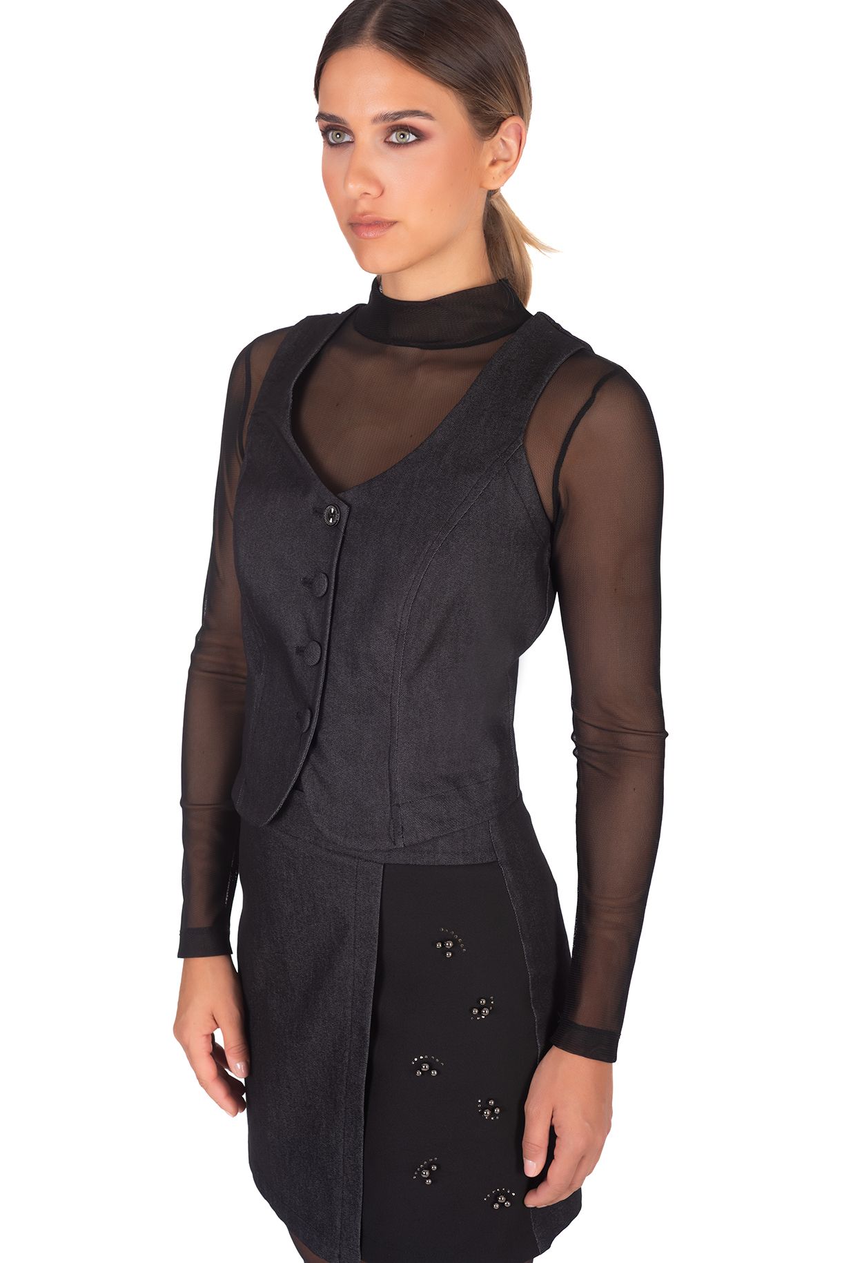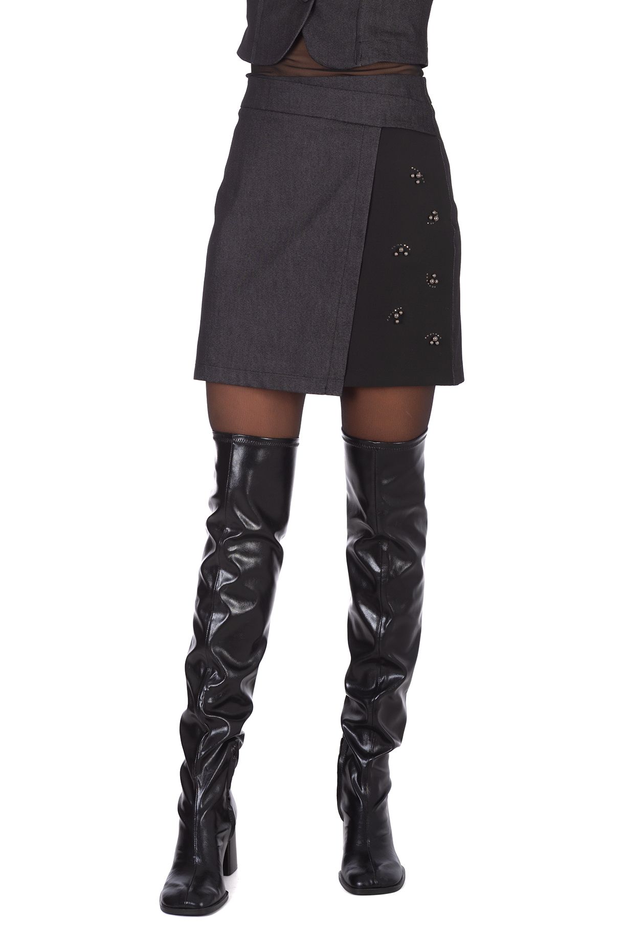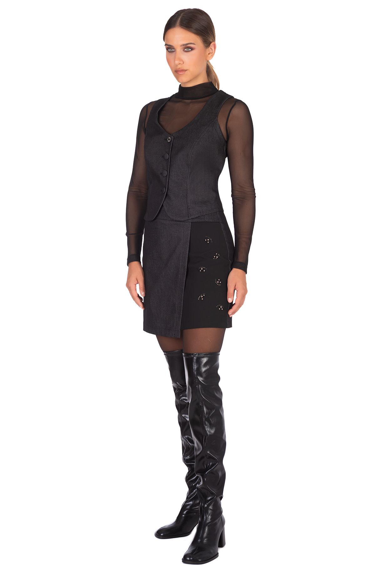 Μαύρη κοντή τζιν φούστα με κεντήματα τρουκς και strass στην μία μεριά. Κουμπώνει με φερμουάρ στο πίσω μέρος. Είναι ελληνικής κατασκευής.