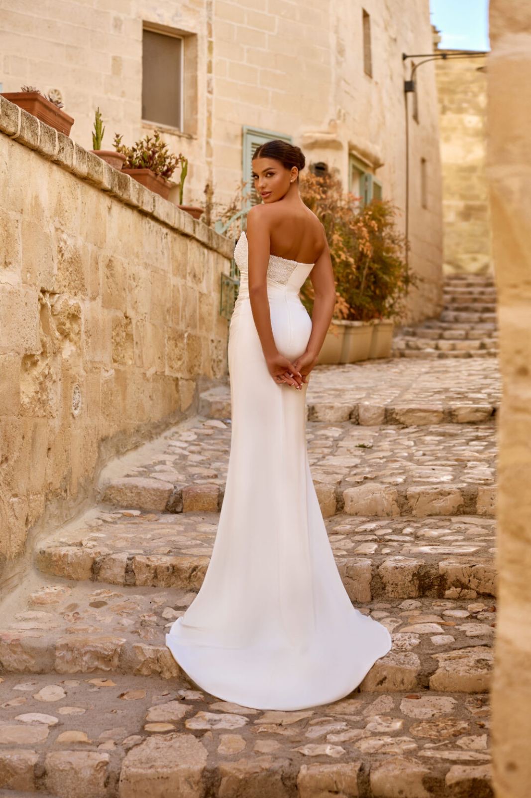Ζήσε τη μαγεία της ημέρας σου με αυτό το υπέροχο στράπλες νυφικό φόρεμα. Το μπούστο είναι στολισμένο με λαμπερές πέρλες, ενώ το σατινέ ύφασμα αγκαλιάζει αρμονικά τη σιλουέτα, αναδεικνύοντας τη θηλυκότητα και την κομψότητά σου. Ιδανικό για έναν ρομαντικό γάμο σε νησί ή στην πόλη, αυτό το νυφικό συνδυάζει την απλότητα με την πολυτέλεια.