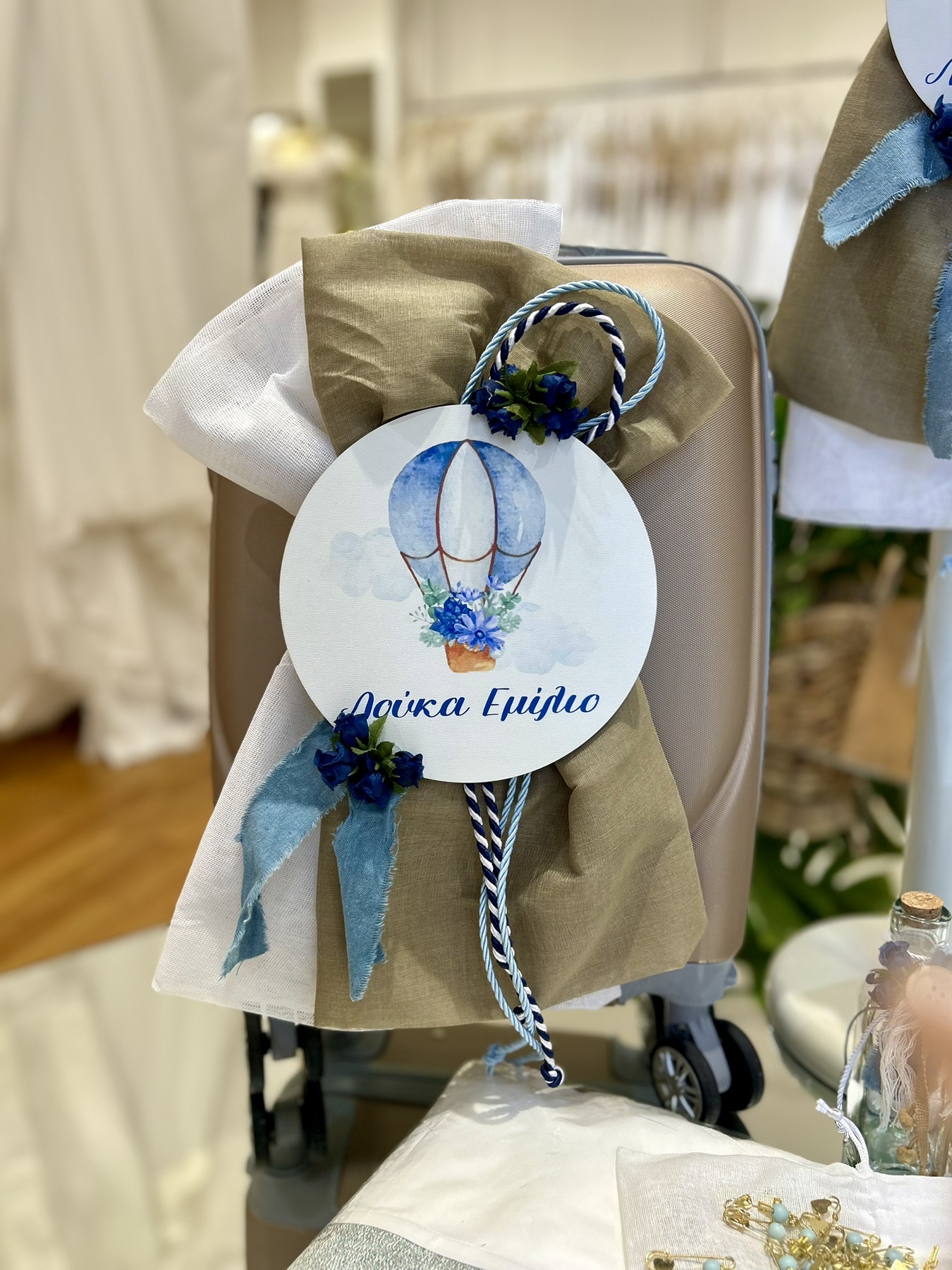 Πακέτο βάπτισης Αερόστατο. Το πακέτο περιλαμβάνει τροχήλατη βαλίτσα, λαδόπανα, 3 κεράκια κολυμπήθρας, σαπουνάκι, μπουκαλάκι λαδιού και 50 μαρτυρικά.