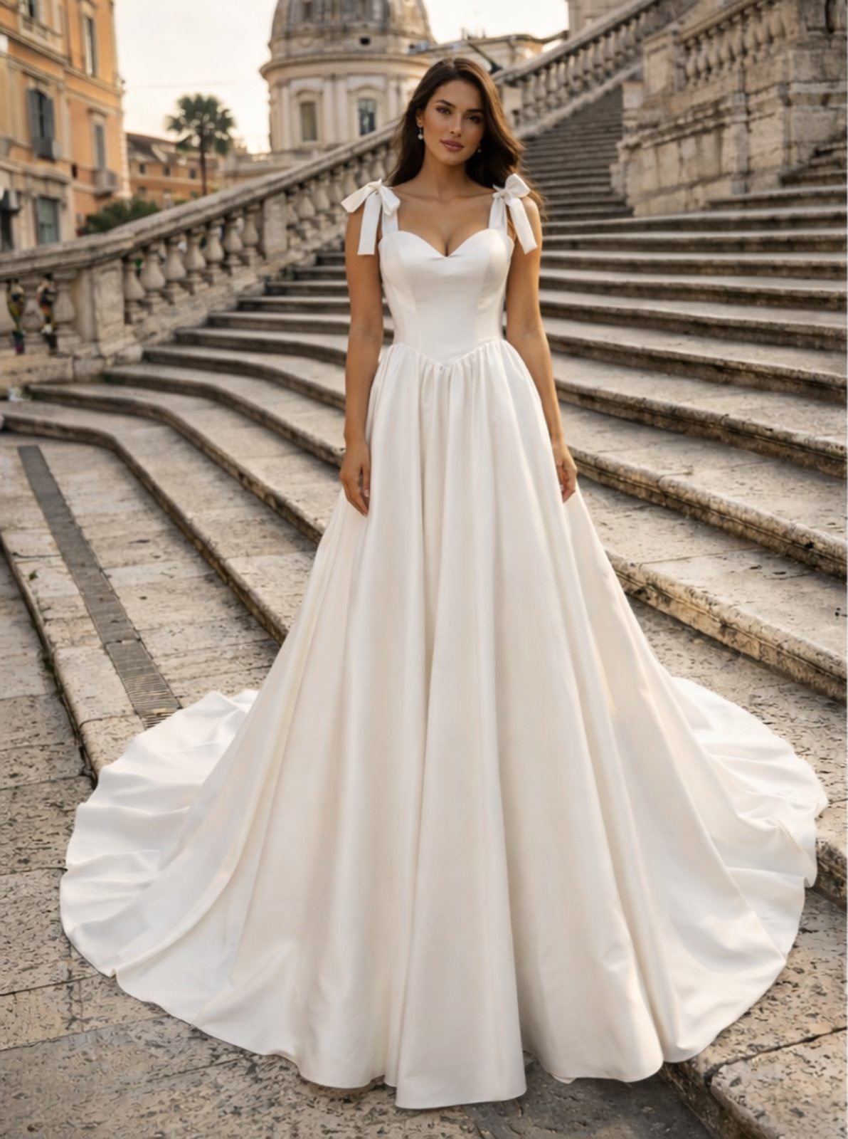 Ένα εκλεπτυσμένο νυφικό που συνδυάζει τη διαχρονική κομψότητα με την ρομαντική αισθητική. Το μπούστο αγκαλιάζει όμορφα το σώμα, δημιουργώντας μια θηλυκή και κομψή γραμμή, ενώ οι λεπτοί φιόγκοι στους ώμους προσθέτουν μια ιδιαίτερα ρομαντική πινελιά. Η πλούσια αέρινη φούστα πέφτει απαλά δημιουργώντας κίνηση και χάρη σε κάθε βήμα της νύφης, ενώ η εντυπωσιακή ουρά ολοκληρώνει το σύνολο με μεγαλοπρέπεια στο πίσω μέρος, το κορσέ με δέσιμο αναδεικνύει τη μέση και προσφέρει τέλεια εφαρμογή.