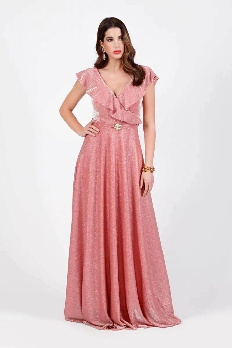 Χαρακτηριστικά: maxi, χρώμα μέντα, ντεκολτέ V, μανίκια κοντά με βολάν, γραμμή αέρινη-θηλυκή, λεπτομέρεια διακοσμητικό στοιχείο στη μέση και στυλ ρομαντικό/επίσημο.