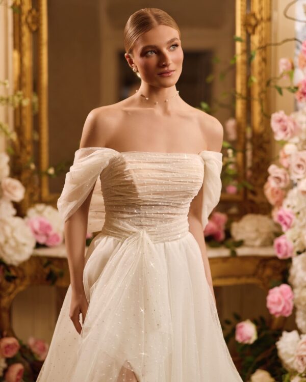 Ανακάλυψε το απόλυτο αέρινο τούλινο νυφικό, σχεδιασμένο για τις νύφες που ονειρεύονται μια παραμυθένια, ρομαντική εμφάνιση. Το ελαφρύ τούλι αγκαλιάζει απαλά το σώμα, προσφέροντας κομψότητα και άνεση σε κάθε βήμα, ενώ το δαντελένιο μπούστο προσθέτει μια διακριτική, θηλυκή λάμψη.