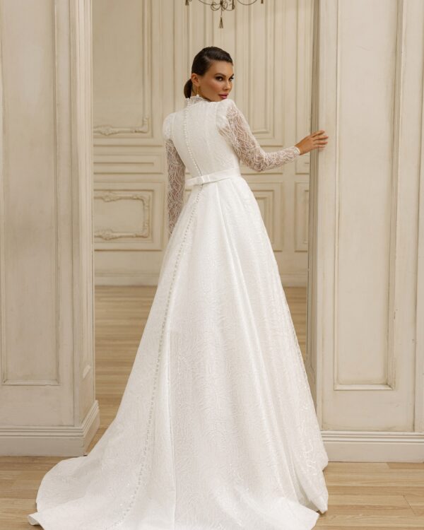 Αρχοντικό νυφικό με μανίκια, βάτες και ουρά. Το νυφικό είναι ζιβάγκο και κλειστό στην πλάτη. Διαθέτει διαφάνεια με σχέδια στα μανίκια και έχει βάτες. Έχει μικρή ουρά