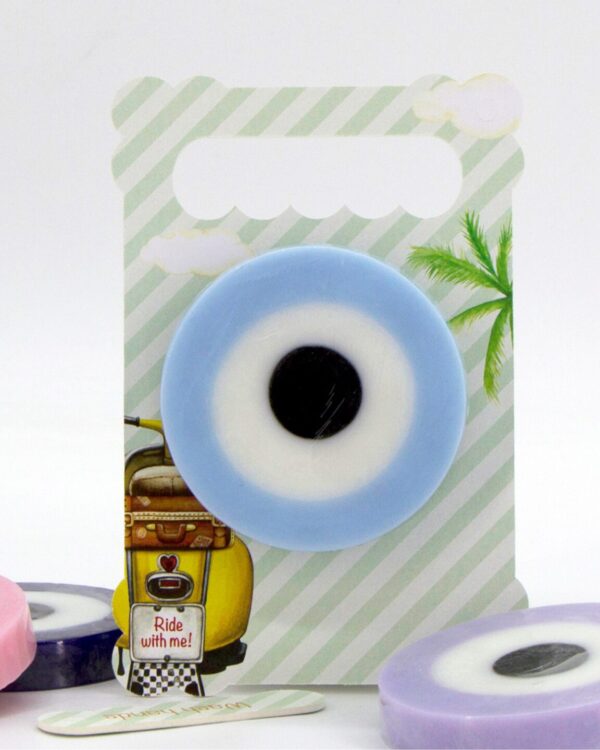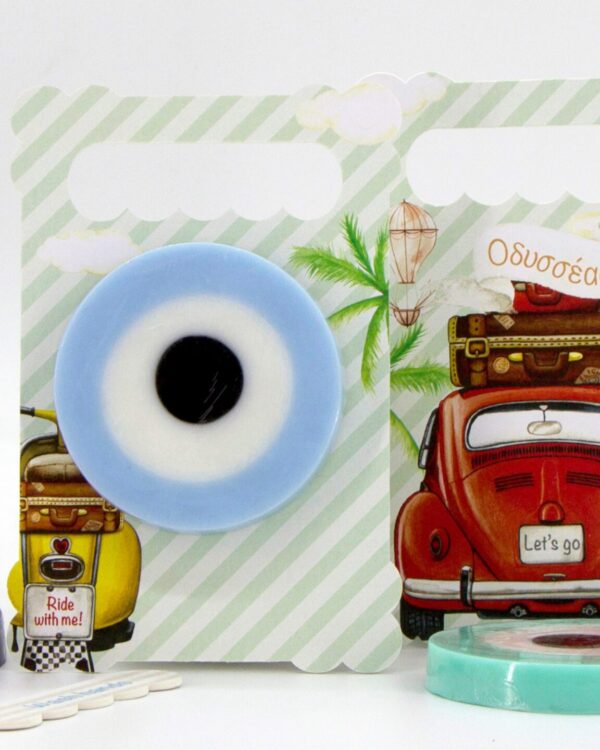 Αρωματικό σαπούνι γλυκερίνης (55γρ) διάστασης Φ7,5cm. Συνοδεύεται από πλάτη στήριξης 10x15cm σε μακετόχαρτο 2χλ, με εκτύπωση 2 όψεων στο θέμα του μυστηρίου. Διατίθεται σε 4 χρώματα/αρώματα επιλογής. Παραδίδεται δεμένο με κουφέτα. Ελάχιστη παραγγελία 10 τεμάχια, συσκευασία 10 τεμαχιών (10τεμ, 20 τεμ.κτλ)