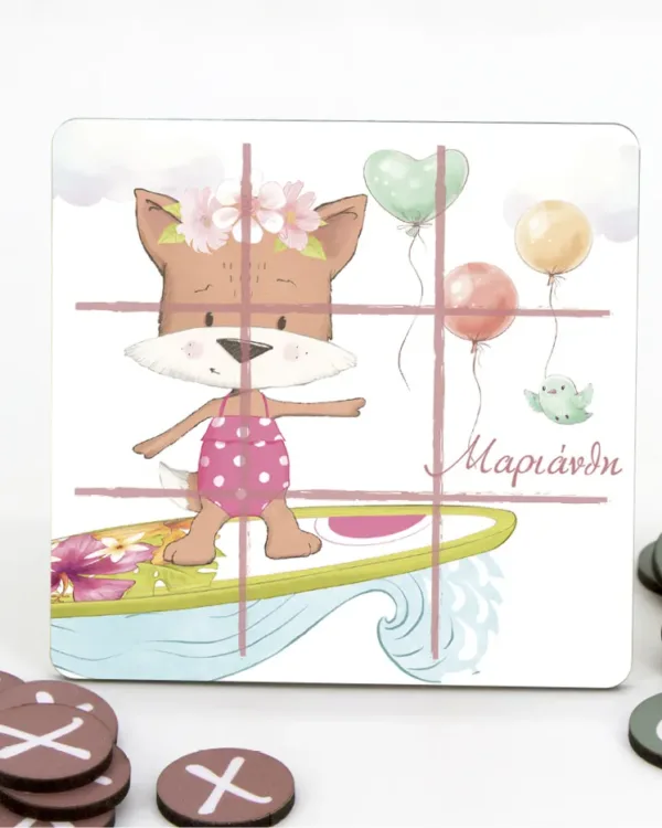 Μπομπονιέρα ξύλινη τρίλιζα με θεματική εκτύπωση.Ξύλινη τρίλιζα πάχους 3χλ, με κοπτικό διάστασης 11×11εκ και τετράχρωμη εκτύπωση στο θέμα του μυστηρίου. Συνοδεύεται από 8 ξύλινα πούλια (Χ και Ο ).