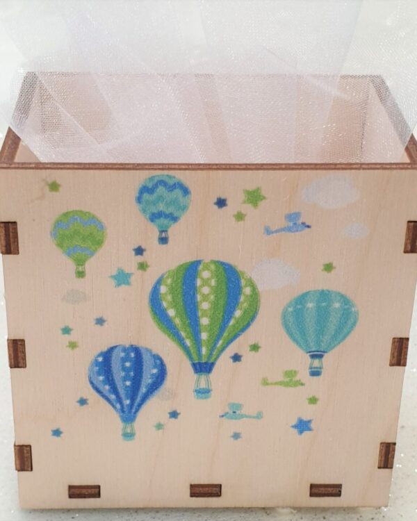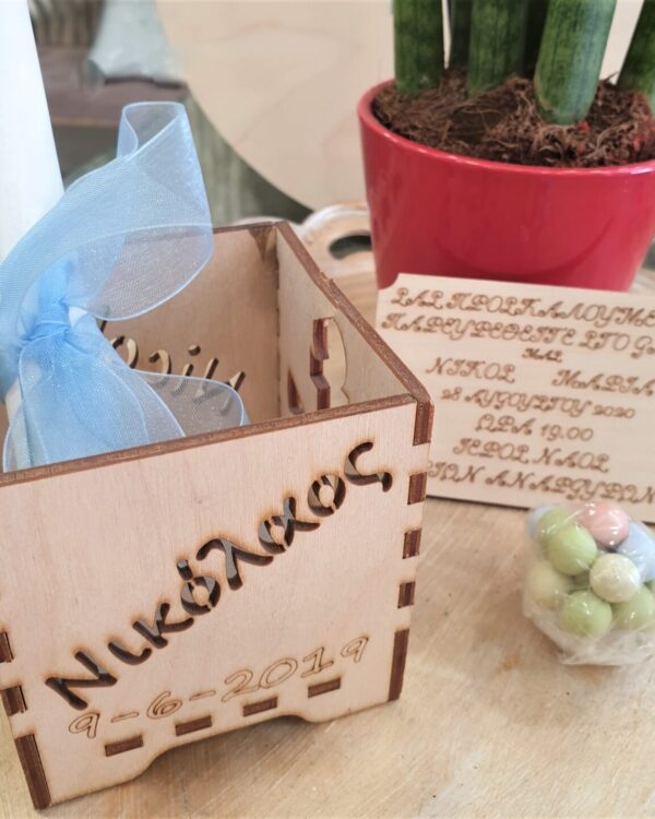 Μπομπονιέρα ξύλινο κουτάκι για χαρτάκια με το θέμα της βάπτισης σας