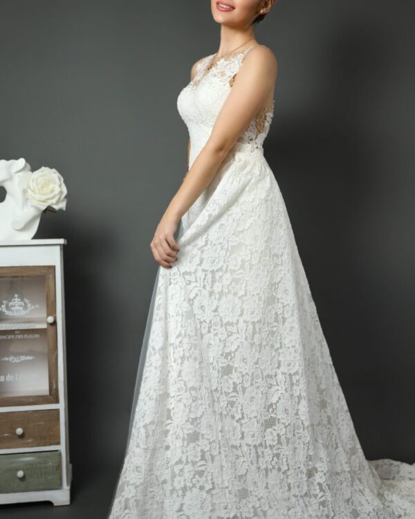 Boho νυφικό φόρεμα με γαλλική δαντέλα και ουρά. Υπέροχη ανοιχτή πλάτη με διαφάνεια soleil και κεντημένη δαντέλα. Κανονική εφαρμογή