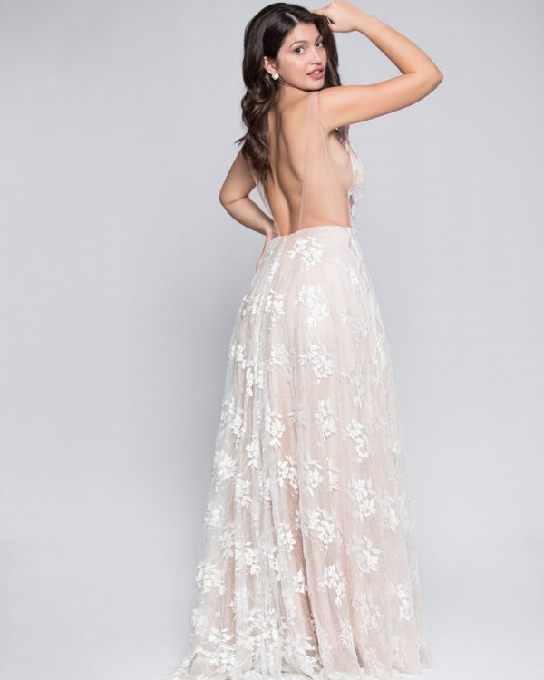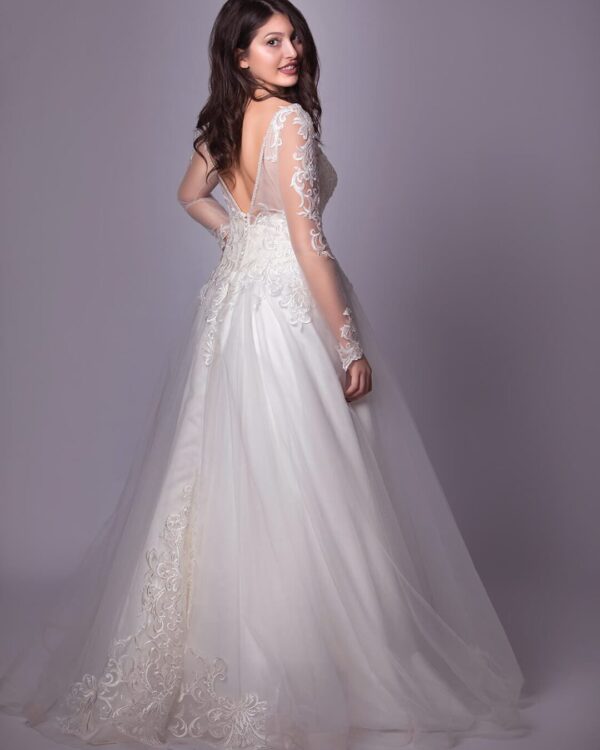 1Εντυπωσιακό γοργονέ νυφικό κεντημένο με πούλιες και πέρλες. Η ουρά ολοκληρώνει το σύνολο με κομψότητα.
