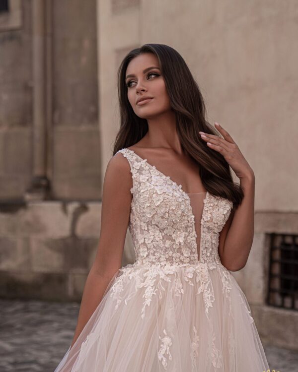 Εντυπωσιακό νυφικό φόρεμα απο τούλι και δαντέλα. Βαθύ, ιδιαίτερο μπούστο V με διαφάνεια.Το νυφικό έχει ουρά και κάνει V από πίσω και χαμηλό V μπροτά. Ιδανικό για πολιτικό και θρησκευτικό γάμο. Κανονική εφαρμογή