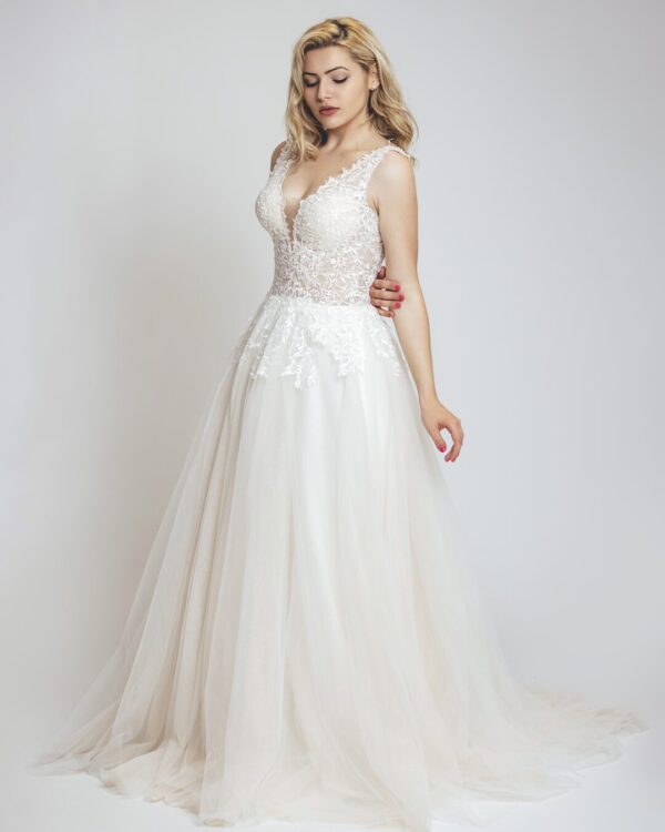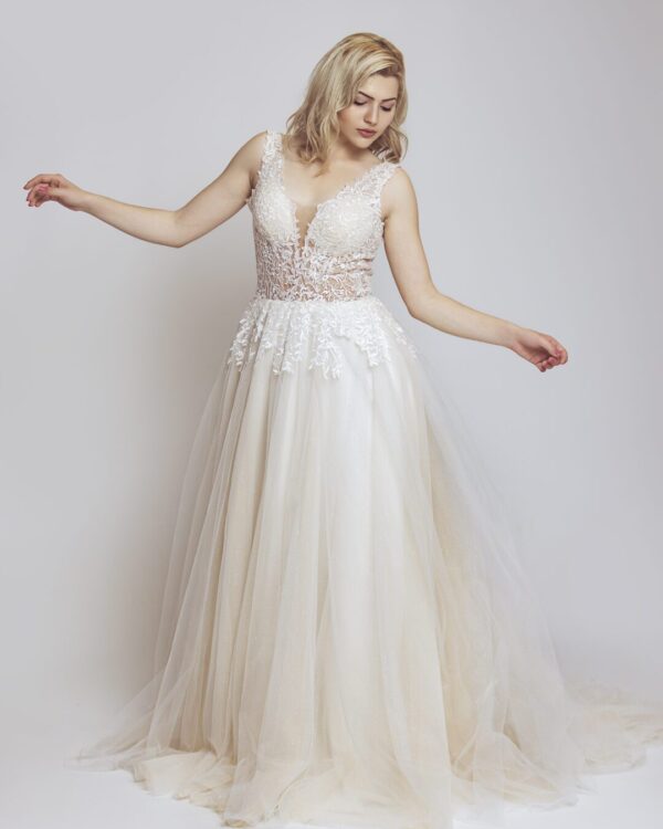 Εντυπωσιακό νυφικό με διαφάνεια στο μπούστο και κεντημένο με ανάγλυφη γαλλική δαντέλα. Φούστα σε άλφα γραμμή, από γαλλικό τούλι σε λευκό με νερά στο χρώμα της πούδρας. Ανοιχτή πλάτη σε βαθύ V. Κανονική εφαρμογή. Το μοντέλο φοράει Medium. Ελληνικής ραφής