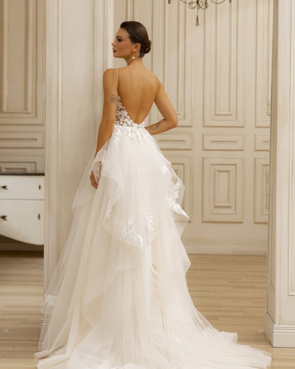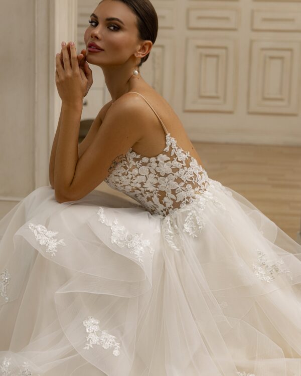 Εντυπωσιακό νυφικό με floral λεπτομέρειες. Διαθέτει τούλινη φούστα και δαντελένιο μπούστο που αναδεικνύει τη μέση σας.