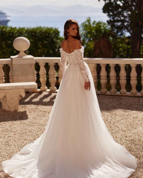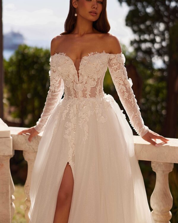 Εντυπωσιακό νυφικό σε γραμμή Α με μακριά μανίκια και κορσέ. Το σχέδιο εντυπωσιακής δαντέλας στο μπούστο συνεχίζεται στην φούστα, δημιουργώντας μια απαλή και ρομαντική εμφάνιση.