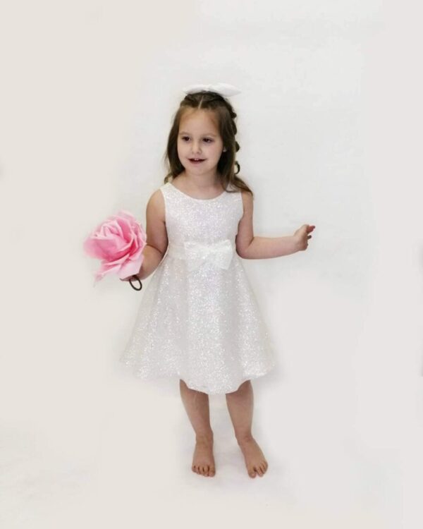 Εντυπωσιακό παιδικό φόρεμα σε λευκό, από ύφασμα σιφόν με γκλίτερ, διακοσμημένο με φιόγκο στην ανοιχτή πλάτη. Ελληνικής ραφής.