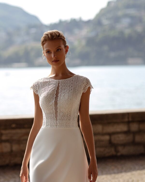 Extra σικ σατέν νυφικό με ουρά. Στο πάνω μέρος είναι όλο κεντητό με διαφάνεια και στο κάτω είναι σατέν και διαθέτει ουρά