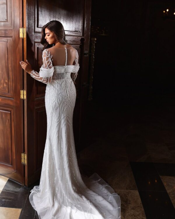 Ολοκεντητο γοργονε νυφικό απο δαντέλα φιλοτεχνημενη στο χέρι, το απόλυτο bootylicious σχήμα, ένα έργο τέχνης για νύφες που ονειρεύονται μια αριστοκρατίκη θηλυκή εμφάνιση.
