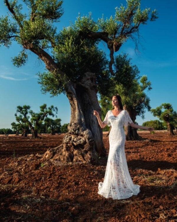Γοργονέ Nυφικό από γαλλική δαντέλα με ανοιχτή πλάτη με βολάν περιμετρικά. Εντυπωσιακή ουρά, μπούστο V και μανίκι δαντέλα. Κανονική εφαρμογή.