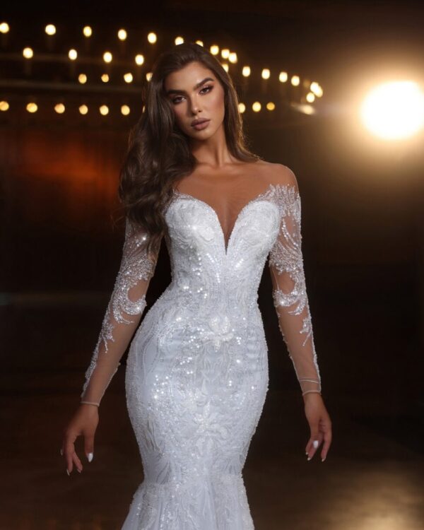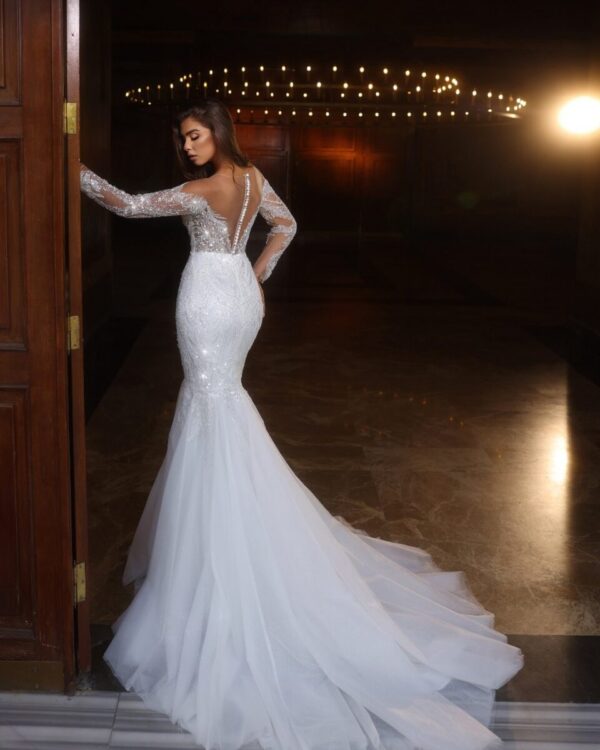 Γοργονέ νυφικό με στράς και ουρά.Είναι στράπλες και έχει βαθύ μπούστο V με διαφάνεια. Στα μανίκια έχει λεπτομέρειες με στράς και διαθέτει ουρά