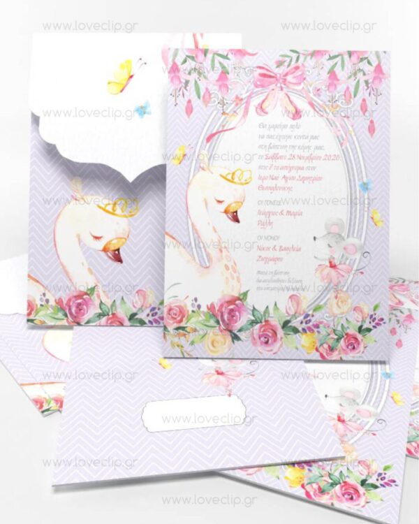 Επίλεξε θέμα βάπτισης το κλασσικό μπαλέτο “η λίμνη των κύκνων”, με τον κύκνο σε ρομαντικό floral περιβάλλον. Διάλεξε το μοτίβο, το είδος προσκλητηρίου εδώ, την μπομπονιέρα εδώ και το πλήρες σετ βάπτισης εδώ, βάλτα στο καλάθι αγορών σου μαζί με αυτό το θέμα και εμείς θα εφαρμόσουμε το θέμα παντού! Το εικαστικό μπορεί να εφαρμοστεί ως προσκλητήριο στα παρακάτω προϊόντα: Μονόκαρτο με exlusive προσωποποιημένο φάκελο (κάρτα: 14,5Χ20εκ – φάκελος: 15Χ21εκ), Παζλ 12 τμχ με εκτυπωμένο κουτί (puzzle: 12Χ17εκ – box: 12Χ12X4εκ), Ξύλινο καδράκι με κάλεσμα σε ρολάκι (τετράγωνο: 12,5×12,5εκ – στρογγυλό: Φ12εκ)