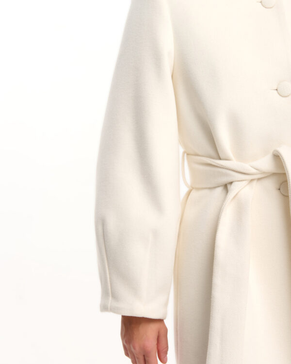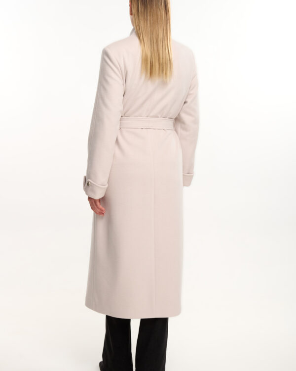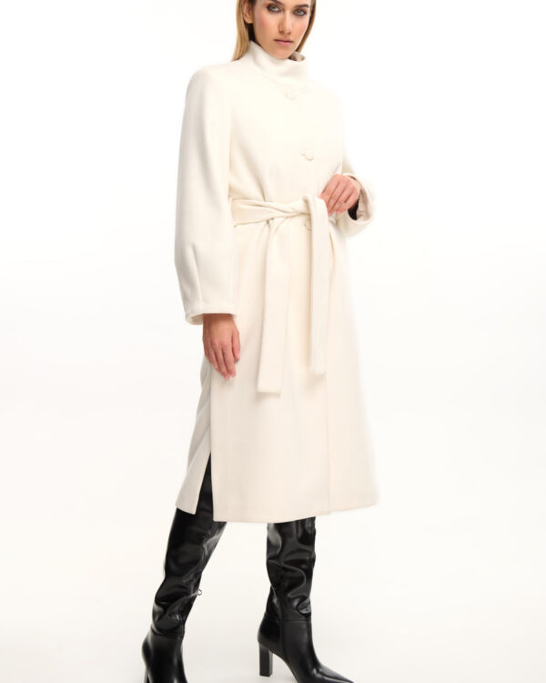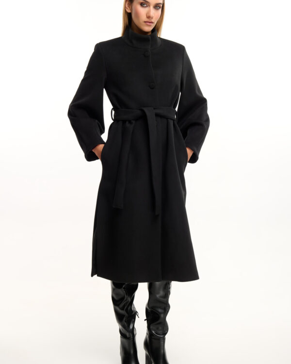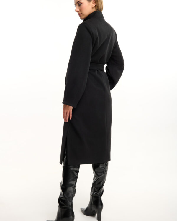 Μακρύ παλτό με όρθιο γιακά και ανοίγματα στο πλάι. Διαθετει αποσπώμενη ζωνη, δυο πλαϊνές τσέπες . Κουμπώνει με κουμπιά. Είναι ελληνικής κατασκευής.