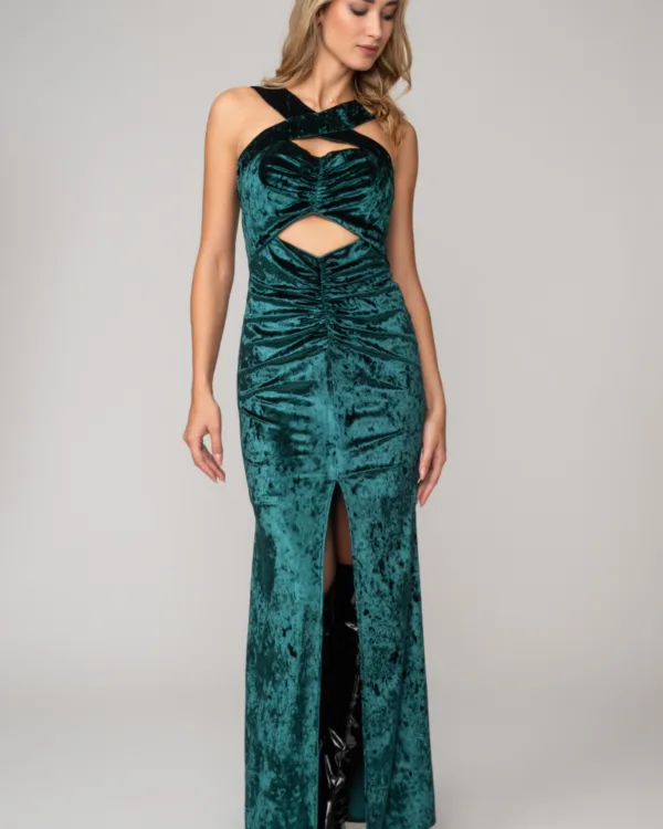 Μακρύ βελούδινο φόρεμα με σούρες μπροστά . Διαθέτει σκίσιμο μπροστά ,άνοιγμα και χοντρές τιράντες χιαστί.