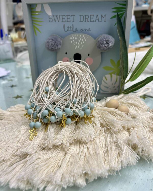 Μαρτυρικά βραχιολάκια για βάπτιση με χρυσό σταυρό και χάντρες . Η επιλογή χρώματος στο κορδονάκι και τις χάντρες είναι δική σας. Το κουτί περιλαμβάνει 50 τεμάχια.