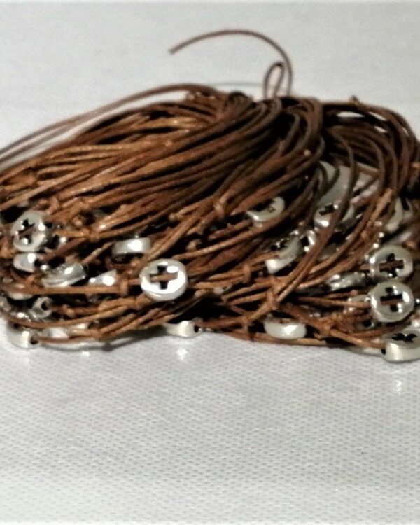 Μαρτυρικά βραχιολάκια για βάπτιση με μεταλλική χάντρα και διάτρητο σταυρουδάκι. Η επιλογή χρώματος στο κορδονάκι και τις χάντρες είναι δική σας. Το κουτί περιλαμβάνει 50 τεμάχια. Είναι χειροποίητα και η παράδοση τους γίνεται σε 10-12 ημέρες.