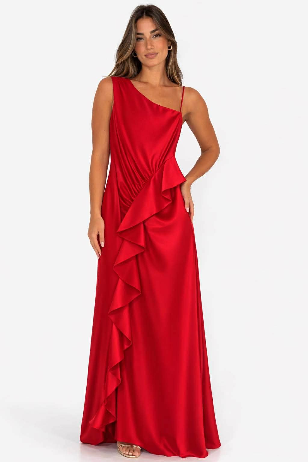 Αυτό το μάξι σατέν φόρεμα είναι η επιτομή της θηλυκότητας και της κομψότητας. Σχεδιασμένο με ασύμμετρο πατρόν στον έναν ώμο και λεπτή τιράντα, αγκαλιάζει μοναδικά τη σιλουέτα, ενώ το εντυπωσιακό βολάν προσθέτει κίνηση και μια αίσθηση πολυτέλειας.
