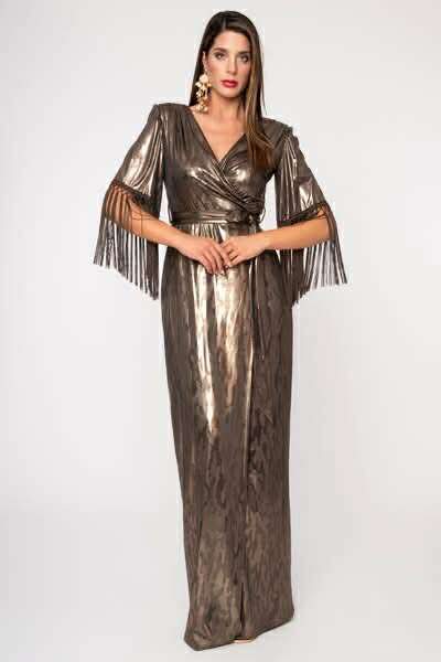 Maxi φόρεμα μεταλιζέ με μανικια. Είναι κρουαζέ και διαθέτει κρόσσια στα μανίκια .
