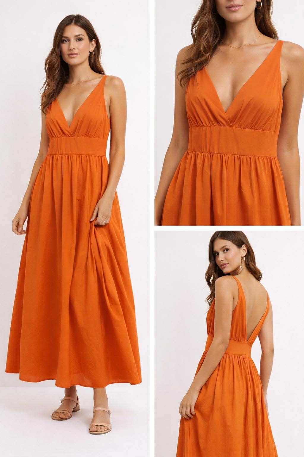 Χαρακτηριστικά: Μήκος maxi, λαιμόκοψη V, βαθύ ντεκολτέ, φαρδιές τιράντες, γραμμή αέρινη άνετη, εφαρμογή κανονική και ύφασμα ταφτά.