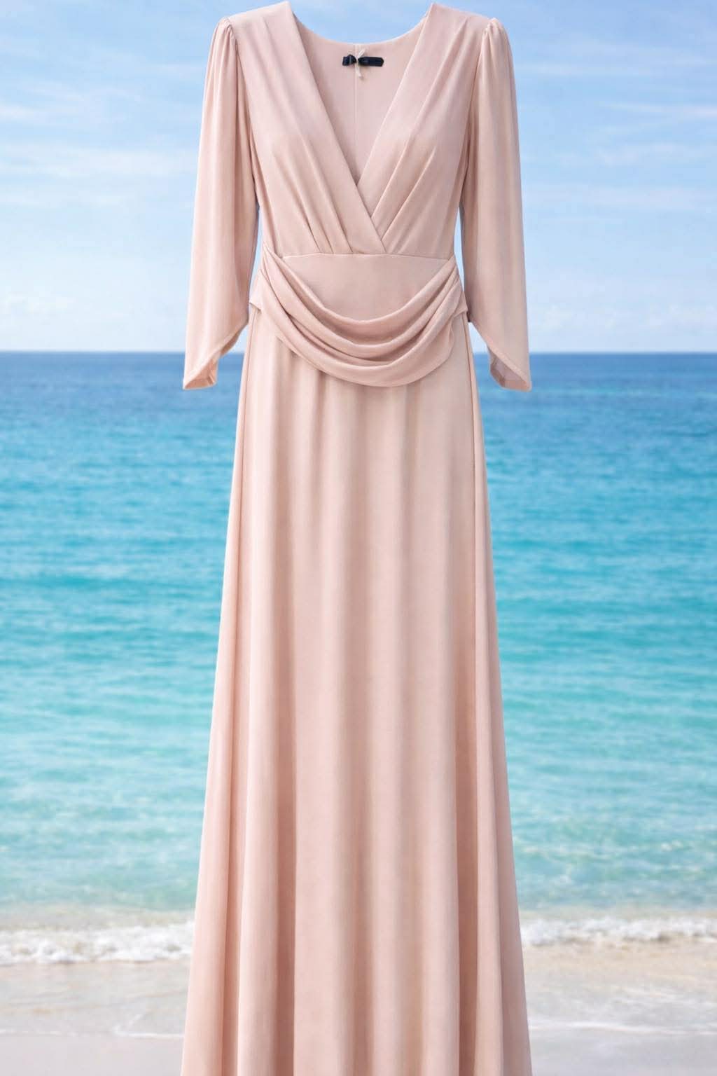 Κομψό maxi φόρεμα σε απαλή ροζ-σαμπανί απόχρωση που αποπνέει θηλυκότητα και διαχρονική φινέτσα . Διαθέτει εντυπωσιακό κρουαζέ ντεκολτέ που αγκαλιάζει όμορφα το μπούστο, ενώ η ντραπέ λεπτομέρεια στην μέση χαρίζει κολακευτική εφαρμογή και αναδεικνύει τη σιλουέτα. Τα μακριά μανίκια προσθέτουν μια αίσθηση κομψότητας, ενώ η μακριά, αέρινη φούστα πέφτει απαλά δημιουργώντας μια ρομαντική και εκλεπτυσμένη κίνηση.