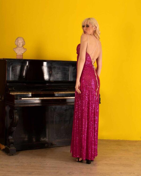 Maxi φόρεμα με γκλίτερ και ανοιχτή πλάτη. Διαθέτει βαθύ μπούστο V, σκίσιμο και ανοιχτή πλάτη με κορδόνια