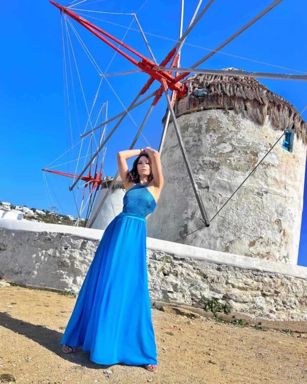 Μaxi φόρεμα με παγιέτα στο πάνω μέρος. Έχει ανοίγματα στο πλάι και ανοιχτή πλάτη