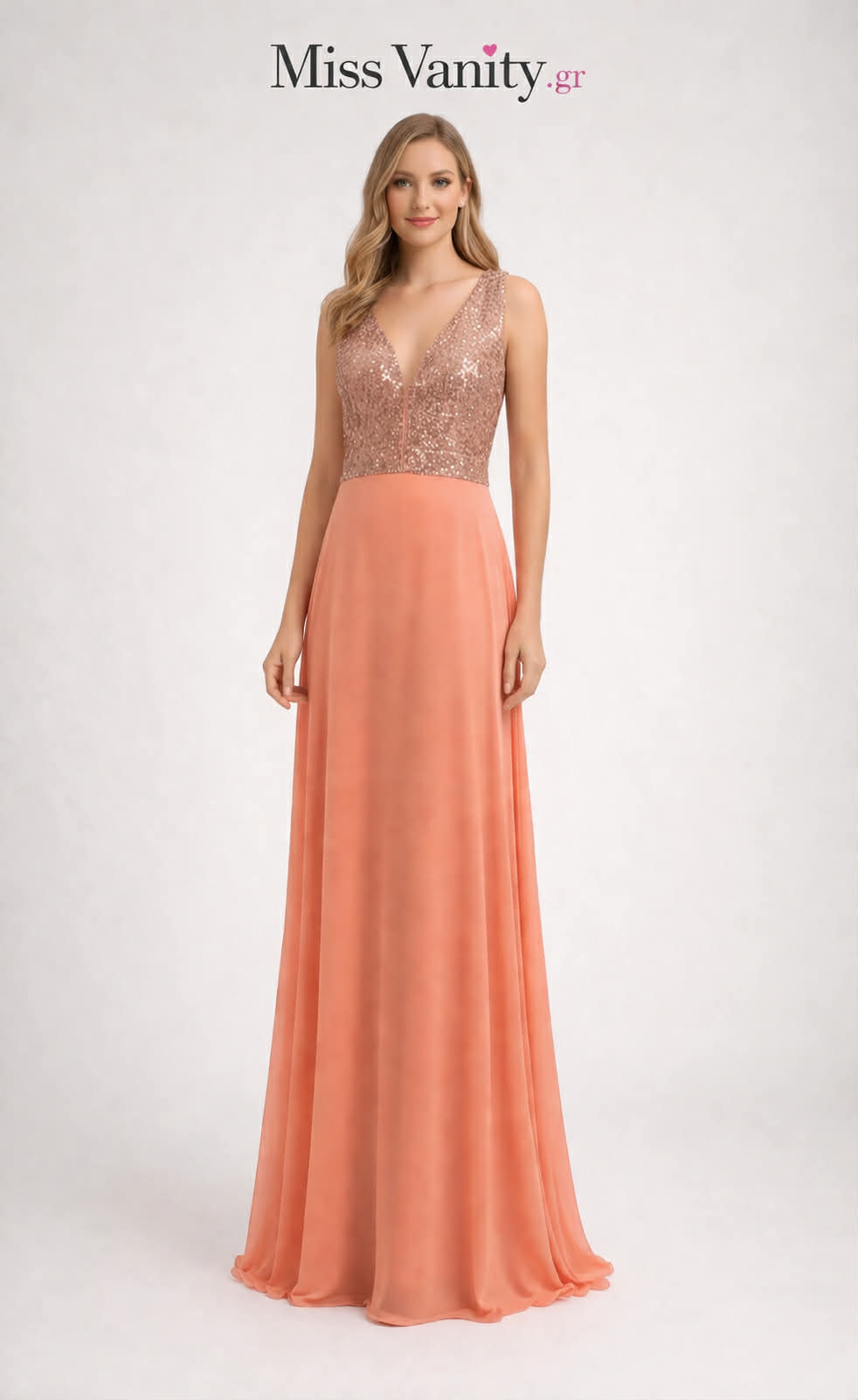 Μάξι φόρεμα με παγιέτες & σιφόν φούστα : Αέρινο & λαμπερό μάξι φόρεμα που αποπνέει ρομαντισμό και κομψότητα. Το μπούστο είναι διακοσμημένο με παγιέτες σε nude-χρυσή απόχρωση, χαρίζοντας διακριτική λάμψη, ενώ η βαθιά V λαιμόκοψη μπροστά και πίσω τονίζει θηλυκά το ντεκολτέ και την πλάτη. Η μακριά σιφόν φούστα σε πορτοκαλί τόνο πέφτει ανάλαφρα δημιουργώντας κίνηση και κομψή σιλουέτα. Το φόρεμα διαθέτει άνετη γραμμή και κλείσιμο με φερμουάρ στο πίσω μέρος για τέλεια εφαρμογή.