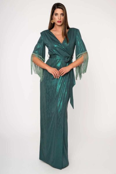 Χαρακτηριστικά : Maxi μήκος, μεταλιζέ ύφασμα με ελαφριά λάμψη, κρουαζέ γραμμή, 3/4 μανίκια με κρόσσια και ανοιχτή πλάτη με δέσιμο.