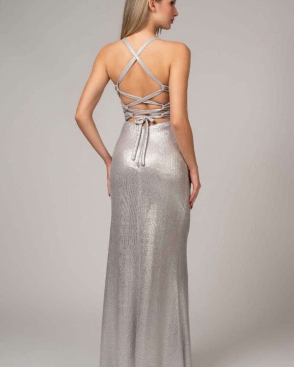 Maxi φόρεμα μεταλιζέ με σκίσιμο στο πλάι και πλάτη χιαστί.