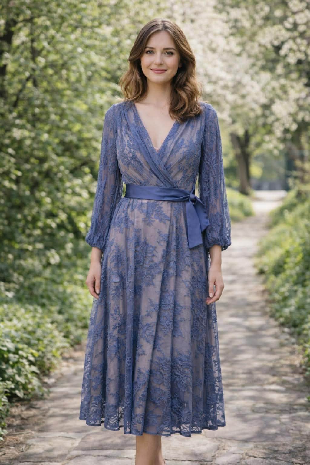 Ένα κομψό midi κρουαζέ φόρεμα σε μπλε απόχρωση, το οποίο συνδυάζει κλασικά και μοντέρνα στοιχεία. Διαθέτει κρουαζέ λαιμόκοψη σε σχήμα V, η οποία κολακεύει το στήθος και τον λαιμό, είναι κατασκευασμένο από ύφασμα με δαντέλα ή ανάγλυφο φλοράλ σχέδιο, προσδίδοντας μια αίσθηση πολυτελείας, έχει μακριά ελαφρώς αέρινα μανίκια με σούρες στις μανσέτες δημιουργώντας ένα διακριτικό εφέ balloon. Συνοδεύεται από μια φαρδιά σατέν ζώνη στην ίδια απόχρωση, η οποία δένει στην μέση για να τονίσει τη σιλουέτα.
