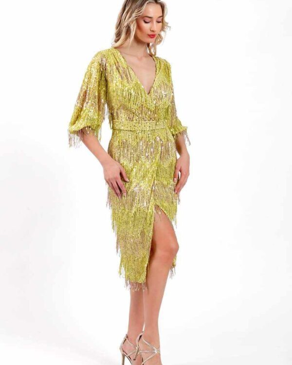 Μidi φόρεμα με κρόσια κρουαζέ. Διαθέτει μανίκι 3/4 και δικό του ζωνάκι. Είναι όλο κρόσια