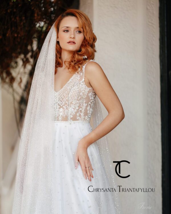 Nυφικό από γαλλικό τούλι κεντημένο με πέρλα. Μπούστο με διαφάνεια soleil και κεντημένο με πέρλα. Κανονική εφαρμογή.